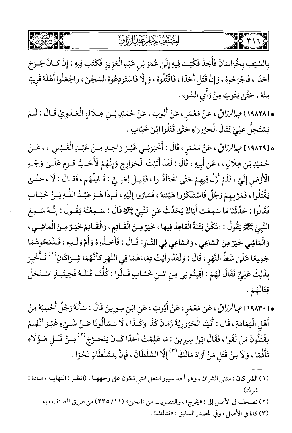 • [١٩٨٣٠] عبد الرزاق، عَنْ مَعْمَرٍ، عَنْ أَيُّوبَ، عَنِ ابْنِ سِيرِينَ قَالَ: سَأَلَهُ رَجُلٌ أَحْسِبُهُ مِنْ أَهْلِ الْيَمَامَةِ، قَالَ: أَتَيْنَا الْحَرُورِيَّةَ زَمَانَ كَذَا وَكَذَا، لَا يَسْأَلُونَا عَنْ شَيْءٍ غَيْرَ أَنَّهُمْ يَقْتُلُونَ مَنْ لَقُوا، فَقَالَ ابْنُ سِيرِينَ: مَا عَلِمْتُ أَحَدًا كَانَ يَتَحَرَّجُ (¬٢) مِنْ قَتْلِ هَؤُلَاء تَأَثُّمًا، وَلَا مِنْ قَتْلِ مَنْ أَرَادَ مَالَكَ (¬٣) إِلَّا السُّلْطَانَ، فَإِنَّ لِلسُّلْطَانِ نَحْوًا.