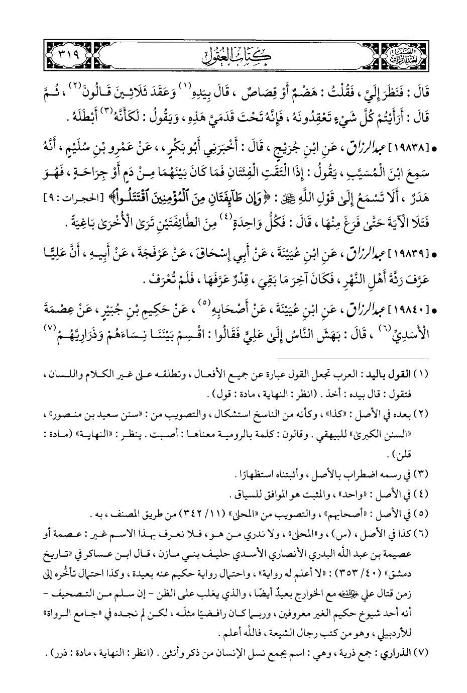 • [١٩٨٤٠] عبد الرزاق، عَنِ ابْنِ عُيَيْنَةَ، عَنْ أَصْحَابِهِ (¬٥)، عَنْ حَكِيمِ بْنِ جُبَيْرٍ، عَنْ عَصْمَةَ الْأَسَدِيِّ (¬٦)، قَالَ: بَهَشَ النَّاسُ إِلَى عَلِيٍّ فَقَالُوا: اقْسِمْ بَيْنَنَا نِسَاءَهُمْ وَذَرَارِيَّهُمْ (¬٧)