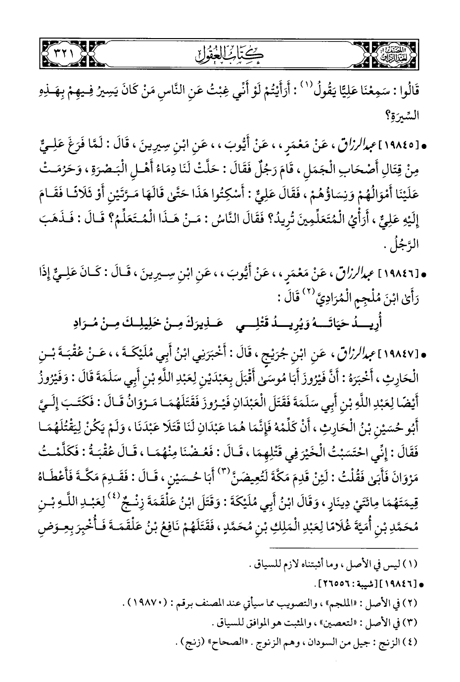 • [١٩٨٤٥] عبد الرزاق، عَنْ مَعْمَرٍ،، عَنْ أَيُّوبَ،، عَنِ ابْنِ سِيرِينَ، قَالَ: لَمَّا فَرَغَ عَلِيٌّ مِنْ قِتَالِ أَصْحَابِ الْجَمَلِ، قَامَ رَجُلٌ فَقَالَ: حَلَّتْ لَنَا دِمَاءُ أَهْلِ الْبَصْرَةِ، وَحَرُمَتْ عَلَيْنَا أَمْوَالُهُمْ وَنِسَاؤُهُمْ، فَقَالَ عَلِيٌّ: أَسْكِتُوا هَذَا حَتَّى قَالَهَا مَرَّتَيْنِ أَوْ ثَلَاثًا فَقَامَ إِلَيْهِ عَلِيٌّ، أَرَأْيُ الْمُتَعَلِّمِينَ تُرِيدُ؟ فَقَالَ النَّاسُ: مَنْ هَذَا الْمُتَعَلِّمُ؟ قَالَ: فَذَهَبَ الرَّجُلُ.