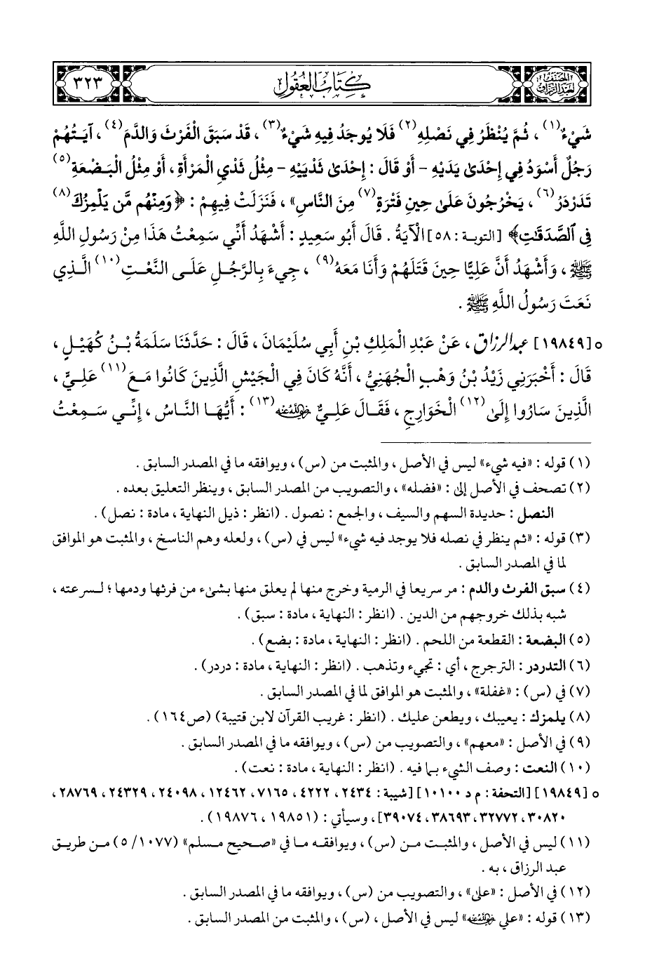 شيْءٌ (¬١)، ثُمَّ يُنْظرُ فِي نَصْلِهِ (¬٢) فَلا يُوجَد فِيهِ شيْءٌ (¬٣)، قد سَبَقَ الفَرثَ وَالدَّمَ (¬٤)، آيَتُهُمْ رَجُلٌ أَسْوَدُ فِي إِحْدَى يَدَيْهِ - أَوْ قَالَ: إِحْدَى ثَدْيَيْهِ - مِثْلُ ثَدْيِ الْمَرْأَةِ، أَوْ مِئْلُ الْبَضْعَةِ (¬٥) تَدَرْدرُ (¬٦)، يَخرُجُونَ عَلَى حِينِ فَتْرَةٍ (¬٧) مِنَ النَّاس"، فَنَزَلَتْ فِيهِمْ: {وَمِنْهُمْ مَنْ يَلْمِزُكَ (¬٨) فِي الصَّدَقَاتِ} [التوبة: ٥٨] الْآيَةُ. قَالَ أَبُو سَعِيدٍ: أَشْهَدُ أَنِّي سَمِعْتُ هَذَا مِنْ رَسُولِ اللهِ - صلى الله عليه وسلم -، وَأَشْهَدُ أَنَّ عَلِيًّا حِينَ قَتَلَهُمْ وَأَنَا مَعَهُ (¬٩)، جِيءَ بِالرَّجُلِ عَلَى النَّعْتِ (¬١٠) الَّذِي نَعَتَ رَسُولُ اللَّهِ - صلى الله عليه وسلم -.