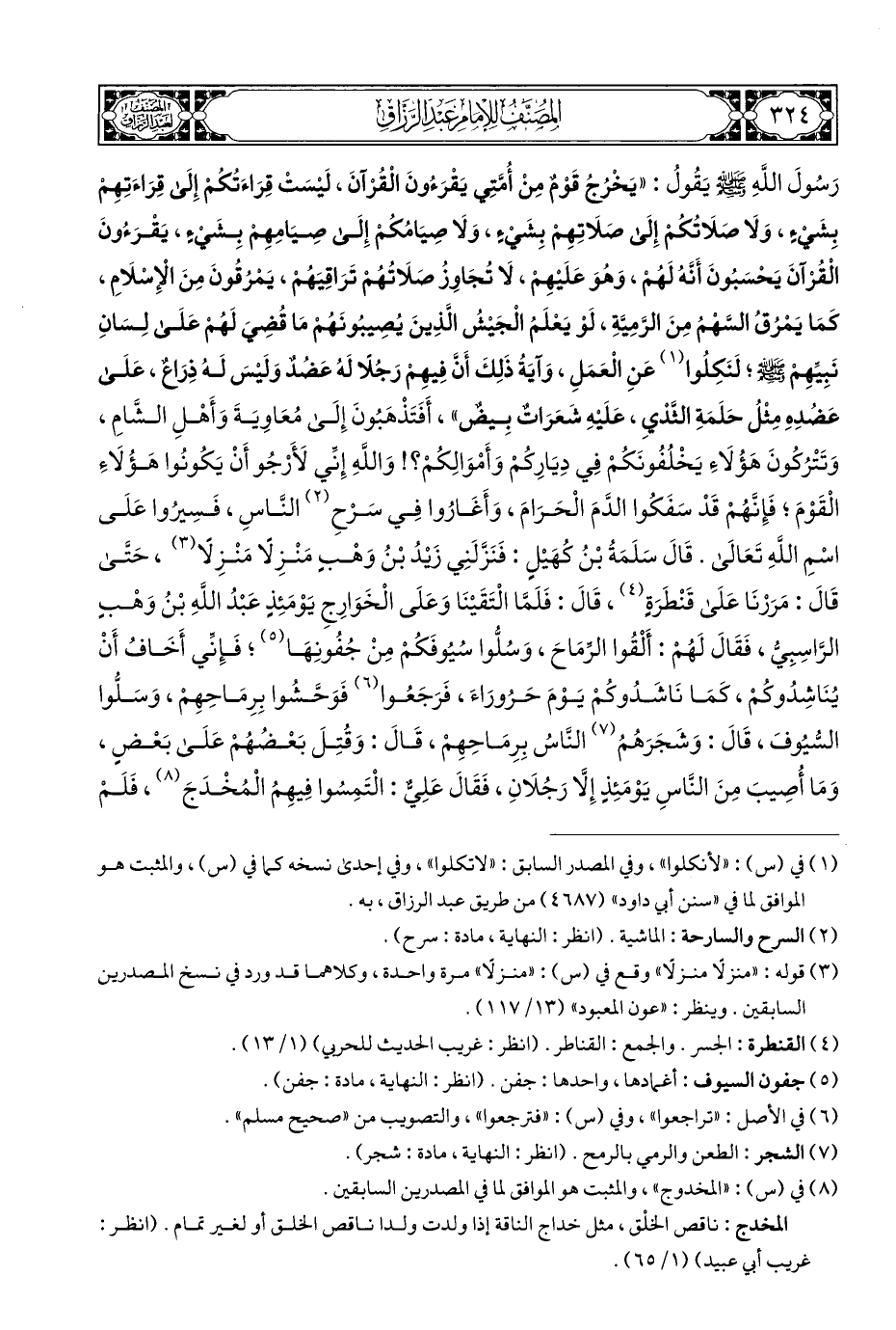 رَسُولَ اللهِ - صلى الله عليه وسلم - يَقُولُ: "يَخْرُجُ قَوْمٌ مِنْ أُمَّتِي يَقْرَءُونَ الْقُرْآنَ، لَيْسَتْ قِرَاءَتُكُمْ إِلَى قِرَاءَتِهِمْ بِشَيْءٍ، وَلَا صَلَاتُكُمْ إِلَى صَلَاتِهِمْ بِشَيْءٍ، وَلَا صِيَامُكُمْ إِلَى صِيَامِهِمْ بِشَيْءٍ، يَقْرَءُونَ الْقُرْآنَ يَحْسَبُونَ أَنَّهُ لَهُمْ، وَهُوَ عَلَيْهِمْ، لَا تُجَاوِزُ صَلَاتُهُمْ تَرَاقِيَهُمْ، يَمْرُقُونَ مِنَ الْإِسْلَامِ، كَمَا يَمْرُقُ السَّهْمُ مِنَ الرَّمِيَّةِ، لَوْ يَعْلَمُ الْجَيْشُ الَّذِينَ يُصِيبُونَهُمْ مَا قُضِيَ لَهُمْ عَلَى لِسَانِ نَبِيِّهِمْ - صلى الله عليه وسلم -، لَنَكِلُوا (¬١) عَنِ الْعَمَلِ، وَآيَةُ ذَلِكَ أَنَّ فِيهِمْ رَجُلًا لَهُ عَضُدٌ وَلَيسَ لَهُ ذِرَاعٌ، عَلَى عَضُدِهِ مِثْلُ حَلَمَةِ الثَّدْيِ، عَلَيْهِ شَعَرَاتٌ بِيضٌ"، أَفَتَذْهَبُونَ إِلَى مُعَاوِيَةَ وَأَهْلِ الشَّامِ، وَتَتْرُكُونَ هَؤُلَاءِ يَخْلُفُونَكُمْ فِي دِيَارِكُمْ وَأَمْوَالِكُمْ؟! وَاللَّهِ إِنِّي لأَرْجُو أَنْ يَكُونُوا هَؤُلَاءِ الْقَوْمَ؛ فَإِنَّهُمْ قَدْ سَفَكُوا الدَّمَ الْحَرَامَ، وَأَغَارُوا فِي سَرْحِ (¬٢) النَّاسِ، فَسِيرُوا عَلَى اسْمِ اللهِ تَعَالَى. قَالَ سَلَمَةُ بْنُ كُهَيْلٍ: فَنَزَّلَنِي زَيْدُ بْنُ وَهْبٍ مَنْزِلًا مَنْزِلًا (¬٣)، حَتَّى قَالَ: مَرَرْنَا عَلَى قَنْطَرَةٍ (¬٤)، قَالَ: فَلَمَّا الْتَقَيْنَا وَعَلَى الْخَوَارِجِ يَوْمَئِذٍ عَبْدُ اللهِ بْنُ وَهْبٍ الرَّاسِبِيُّ، فَقَالَ لَهُمْ: أَلْقُوا الرِّمَاحَ، وَسُلُّوا سُيُوفَكُمْ مِنْ جُفُونِهَا (¬٥)؛ فَإِنِّي أَخَافُ أَنْ يُنَاشِدُوكُمْ، كَمَا نَاشَدُوكُمْ يَوْمَ حَرُورَاءَ، فَرَجَعُوا (¬٦) فَوَحَّشُوا بِرِمَاحِهِمْ، وَسَلُّوا السُّيُوفَ، قَالَ: وَشَجَرَهُمُ (¬٧) النَّاسُ بِرِمَاحِهِمْ، قَالَ: وَقُتِلَ بَعْضُهُمْ عَلَى بَعْضٍ، وَمَا أُصِيبَ مِنَ النَّاسِ يَوْمَئِذٍ إِلَّا رَجُلَانِ، فَقَالَ عَلِيٌّ: الْتَمِسُوا فِيهِمُ الْمُخْدَجَ (¬٨)، فَلَمْ