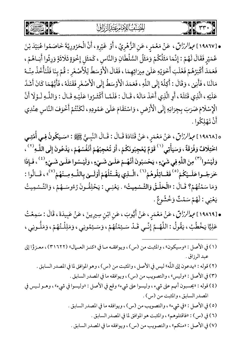 ° [١٩٨٦٨] عبد الرزاق، عَنْ مَعْمَرٍ، عَنْ قَتَادَةَ قَالَ: قَالَ النَّبِي - صلى الله عليه وسلم -: "سَيَكُونُ فِي أُمَّتِي اخْتِلَافٌ وَفُرْقَةٌ، وَسَيَأْتِي (¬١) قَوْمٌ يُعْجِبُونَكُمْ، أَوْ تُعْجِبُهُمْ أَنْفُسُهُمْ، يَدْعُونَ إِلَى اللَّهِ (¬٢)، وَلَيْسُوا (¬٣) مِنَ اللَّهِ فِي شَيْءٍ، يَخسَبُونَ أَنَّهُمْ عَلَى شَيْءٍ، وَلَيْسُوا عَلَى شَيْءٍ (¬٤)، فَإِذَا خَرَجُوا عَلَيْكُمْ (¬٥) فَقَاتِلُوهُمْ (¬٦)، الَّذِي يَقْتُلُهُمْ أَوْلَى بِاللَّهِ مِنْهُمْ (¬٧) "، قَالُوا: وَمَا سَمْتُهُمْ؟ قَالَ: "الْحَلْقُ وَالتَّسْمِيتُ". يَعْنِي: يَحْلِقُونَ رُءُوسَهُمْ، وَالتَّسْمِيتُ يَعْنِي: لَهُمْ سَمْتٌ وَخُشُوعٌ.