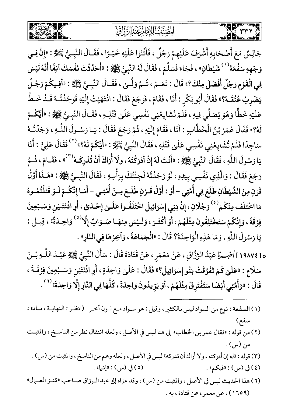 ° [١٩٨٧٤] أخبرنا عَبْدُ الرَّزاقِ، عَنْ مَعْمَرٍ، عَنْ قَتَادَةَ قَالَ: سَأَلَ النَّبِيُّ - صلى الله عليه وسلم - عبْدَ اللَّهِ بْنَ سَلَامٍ: "عَلَى كَمْ تَفَرَّقَتْ بَنُو إِسْرَائيلَ؟ " فَقَالَ: عَلَى وَاحِدَةٍ، أَوِ اثْنَتَيْنِ وَسَبْعِينَ فِرْقَةً، قَالَ: "وَأُمَّتِي أَيْضًا سَتَفْتَرِقُ مِثْلَهُمْ، أَوْ يَزِيدُونَ وَاحِدَةً، كُلُّهَا فِي النَّارِ إِلَّا وَاحِدَةً" (¬٦).
