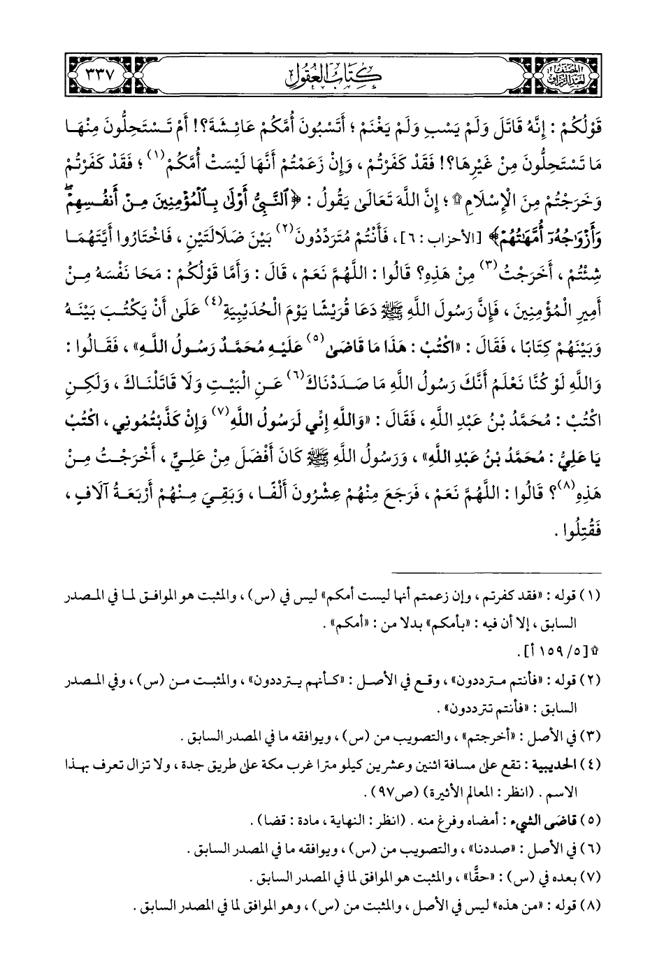قَوْلُكُمْ: إِنَّهُ قَاتَلَ وَلَمْ يَسْبِ وَلَمْ يَغْنَمْ؛ أَتَسْبُونَ أُمَّكُمْ عَائِشَةَ؟! أَمْ تَسْتَحِلُّونَ مِنْهَا مَا تَسْتَحِلُّونَ مِنْ غَيْرِهَا؟! فَقَدْ كَفَرْتُمْ، وإِنْ زَعَمْتُمْ أَنَّهَا لَيْسَتْ أُمَّكُمْ (¬١)؛ فَقَدْ كَفَرْتُمْ وَخَرَجْتُمْ مِنَ الْإِسْلَامِ *؛ إِنَّ اللَّهَ تَعَالَى يَقُولُ: {النَّبِيُّ أَوْلَى بِالْمُؤْمِنِينَ مِنْ أَنْفُسِهِمْ وَأَزْوَاجُهُ أُمَّهَاتُهُمْ} [الأحزاب: ٦]، فَأَنْتُمْ مُتَرَدِّدُونَ (¬٢) بَيْنَ صَلَالَتَيْنِ، فَاخْتَارُوا أَيَّتَهُمَا شِئْتُمْ، أَخَرَجْتُ (¬٣) مِنْ هَذِهِ؟ قَالُوا: اللَّهُمَّ نَعَمْ، قَالَ: وَأَمُّا قَوْلُكُمْ: مَحَا نَفْسَهُ مِنْ أَمِيرِ الْمُؤْمِنِينَ، فَإِنَّ رَسُولَ اللَّهِ - صلى الله عليه وسلم - دَعَا قُرَيْشًا يَوْمَ الْحُدَيْبِيَةِ (¬٤) عَلَى أَنْ يَكْتُبَ بَيْنَهُ وَبَيْنَهُمْ كِتَابًا، فَقَالَ: "اكْتُبْ: هَذَا مَا قَاضَى (¬٥) عَلَيْهِ مُحَمَّد رَسُولُ اللَّهِ"، فَقَالُوا: وَاللَّهِ لَوْ كُنَّا نَعْلَمُ أَنَّكَ رَسُولُ اللَّهِ مَا صَدَدْنَاكَ (¬٦) عَنِ الْبَيْتِ وَلَا قَاتَلْنَاكَ، وَلَكِنِ اكْتُبْ: مُحَمَّدُ بْنُ عَبْدِ اللَّهِ، فَقَالَ: "وَاللَّهِ إِنِّي لَرَسُولُ اللَّهِ (¬٧) وَإِنْ كَذَّبْتُمُونِي، اكْتُبْ يَا عَلِيُّ: مُحَمَّدُ بْنُ عَبْدِ اللهِ"، وَرَسُولُ اللَّهِ - صلى الله عليه وسلم - كَانَ أَفْضَلَ مِنْ عَلِيٍّ، أَخْرَجْتُ مِنْ هَذِهِ (¬٨)؟ قَالُوا: اللَّهُمَّ نَعَمْ، فَرَجَعَ مِنْهُمْ عِشْرُونَ أَلْفًا، وَبَقِيَ مِنْهُمْ أَرْبَعَةُ آلَافٍ، فَقُتِلُوا.