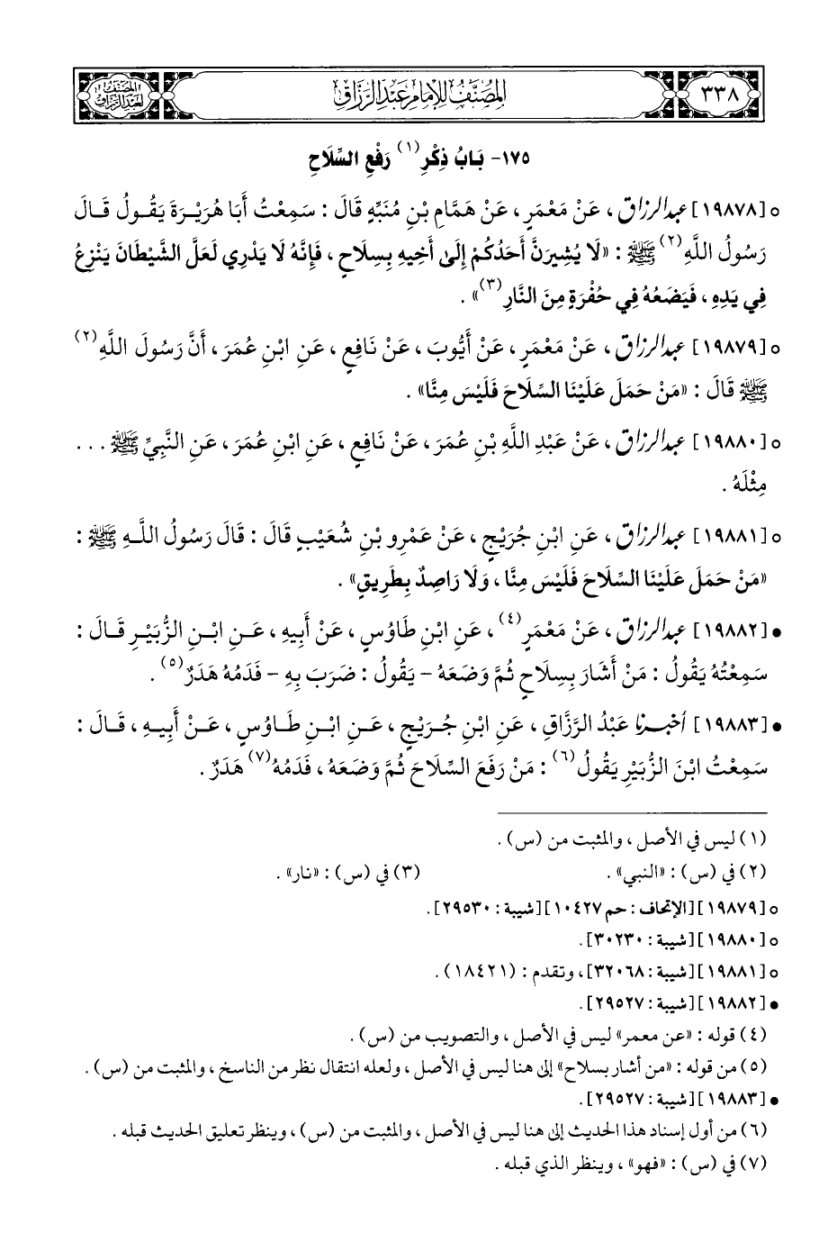 ° [١٩٨٧٩] عبد الرزاق، عَنْ مَعْمَرٍ، عَنْ أَيُّوبَ، عَنْ نَافِعٍ، عَنِ ابْنِ عُمَرَ، أَنَّ رَسُولَ اللَّهِ (٢) - صلى الله عليه وسلم - قَالَ: "مَنْ حَمَلَ عَلَيْنَا السِّلَاحَ فَلَيْسَ مِنَّا".