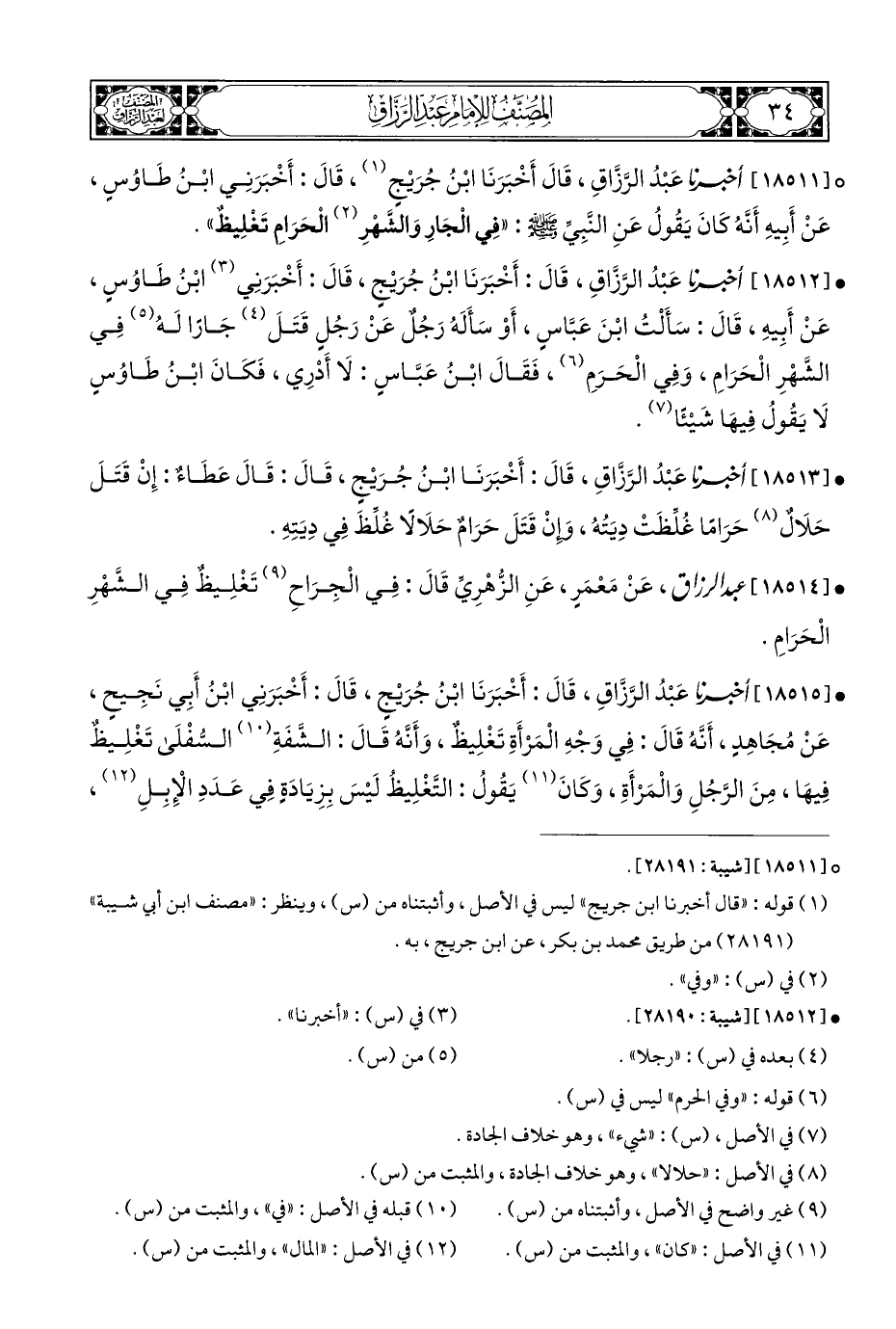 ° [١٨٥١١] أخبرنا عَبْدُ الرَّزَّاقِ، قَالَ أَخْبَرَنَا ابْنُ جُرَيْجٍ (¬١)، قَالَ: أَخْبَرَنِي ابْنُ طَاوُسٍ، عَنْ أَبِيهِ أَنَّهُ كَانَ يَقُولُ عَنِ النَّبِي - صلى الله عليه وسلم -: "فِي الْجَارِ وَالشَّهْرِ (¬٢) الْحَرَامِ تَغْلِيظٌ".