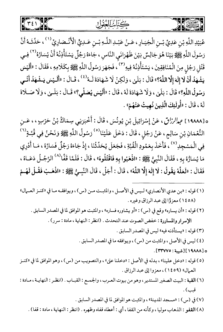 ° [١٩٨٨٨] عبد الرزاق، عَنْ إِسْرَائِيلَ بْنِ يُونُسَ، قَالَ: أَخْبَرَنِي سِمَاكُ بْنُ حَرْبٍ، عَنِ النُّعْمَانِ بْنِ سَالِمٍ، عَنْ رَجُلٍ، قَالَ: دَخَلَ عَلَيْنَا (¬٥) رَسُولُ اللَّهِ - صلى الله عليه وسلم - ونَحْنُ فِي قُبَّةٍ (¬٦) فِي الْمَسْجِدِ (¬٧)، فَأَخَذَ بِعَمُودِ الْقُبَّةِ، فَجَعَلَ يُحَدِّثُنَا، إِذْ جَاءَهُ رَجُلٌ فَسَارَّه، مَا أَدْرِي مَا يُسَارُّهُ بِهِ، فَقَالَ النَّبِيُّ - صلى الله عليه وسلم -: "اذْهَبُوا بِهِ فَاقْتُلُوهُ"، قَالَ: فَلَمَّا قَفَّا (¬٨) الرَّجُلُ دَعَاه، فَقَالَ: "لَعَلَّهُ يَقُولُ: لَا إِلَهَ إِلَّا اللَّهُ"، قَالَ: أَجَلْ، قَالَ النَّبِيُّ - صلى الله عليه وسلم -: "اذْهَبْ فَقُلْ لَهُمْ