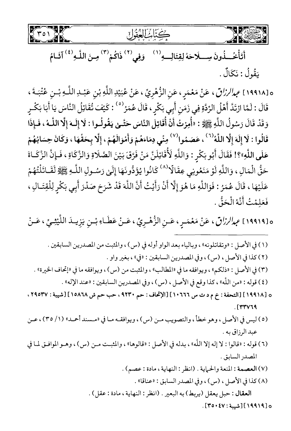 ° [١٩٩١٨] عبد الرزاق، عَنْ مَعْمَرٍ، عَنِ الزُّهْرِيِّ، عَنْ عُبَيْدِ اللَّهِ بْنِ عَبْدِ اللَّهِ بْنِ عُتْبَةَ، قَالَ: لَمَّا ارْتَدَّ أَهْلُ الرِّدَّةِ فِى زَمَنِ أَبِي بَكْرٍ، قَالَ عُمَرُ (¬٥): كَيْفَ تُقَاتِلُ النَّاسَ يَا أَبَا بَكْرٍ وَقَدْ قَالَ رَسُولُ اللَّهِ - صلى الله عليه وسلم -: "أُمِرْتُ أَن أُقَاتِلَ النَّاسَ حَتى يَقُولُوا: لَا إِلَهَ إِلَّا اللَّه، فَإِذَا قَالُوا: لَا إِلَهَ إِلَّا اللَّهُ (¬٦)، عَصَمُوا (¬٧) مِنِّي دِمَاءَهُمْ وَأَمْوَالَهُمْ، إِلَّا بِحَقِّهَا، وَكَانَ حِسَابُهُمْ عَلَى اللَّهِ "؟! فَقَالَ أَبُو بَكْرٍ: وَاللَّهِ لأُقَاتِلَنَّ مَنْ فَرَّقَ بَيْنَ الصَّلَاةِ وَالزَّكَاةِ، فَإِنَّ الزَّكَاةَ حَقُّ الْمَالِ، وَاللَّهِ لَوْ مَنَعُونِي عِقَالًا (¬٨) كَانُوا يُؤَدُّونَهَا إِلَى رَسُولِ اللَّهِ - صلى الله عليه وسلم - لَقَاتَلْتُهُمْ عَلَيْهَا، قَالَ عُمَرُ: فَوَاللَّهِ مَا هُوَ إِلَّا أَنْ رَأَيْتُ أَنَّ اللَّهَ قَدْ شَرَحَ صَدْرَ أَبِي بَكْرٍ لِلْقِتَالِ، فَعَلِمْتُ أَنَّهُ الْحَقُّ.