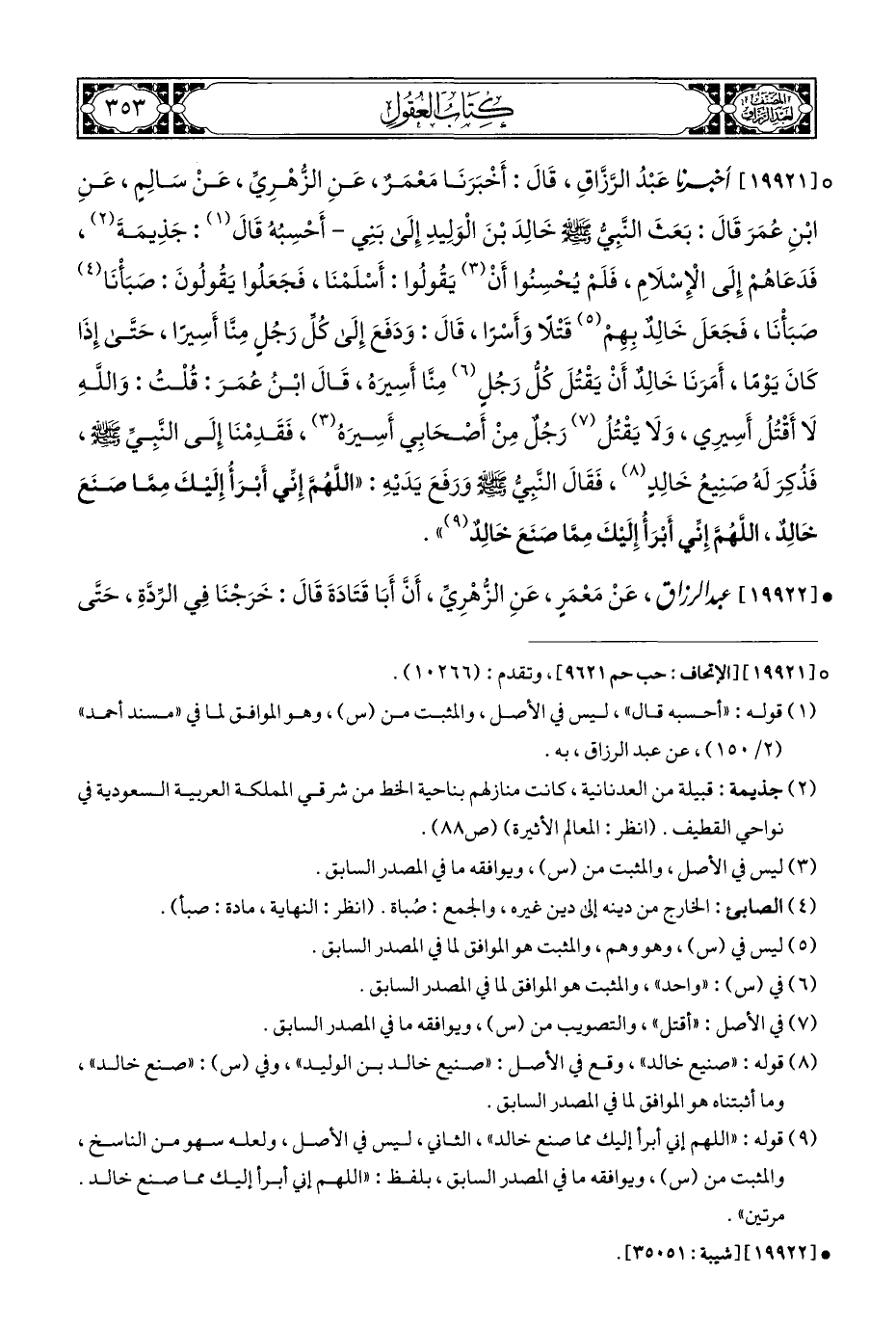° [١٩٩٢١] أخبرنا عَبْدُ الرَّزَّاقِ، قَالَ: أَخْبَرَنَا مَعْمَرٌ، عَنِ الزُّهْرِيِّ، عَنْ سَالِمٍ، عَنِ ابْنِ عُمَرَ قَالَ: بَعَثَ النَّبِيُّ - صلى الله عليه وسلم - خَالِدَ بْنَ الْوَلِيدِ إِلَى بَنِي - أَحْسِبُهُ قَالَ (¬١): جَذِيمَةَ (¬٢)، فَدَعَاهُمْ إِلَى الْإِسْلَامِ، فَلَمْ يُحْسِنُوا أَنْ (¬٣) يَقُولُوا: أَسْلَمْنَا، فَجَعَلُوا يَقُولُونَ: صَبَأْنَا (¬٤) صَبَأْنَا، فَجَعَلَ خَالِدٌ بِهِمْ (¬٥) قَتْلًا وَأَسْرًا، قَالَ: وَدَفَعَ إِلَى كُلِّ رَجُلٍ مِنَّا أَسِيرًا، حَتَّى إِذَا كَانَ يَوْمًا، أَمَرَنَا خَالِدٌ أَنْ يَقْتُلَ كُلُّ رَجُلٍ (¬٦) مِنَّا أَسِيرَه، قَالَ ابْنُ عُمَرَ: قُلْتُ: وَاللَّهِ لَا أَقْتُلُ أَسِيرِي، وَلَا يَقْتُلُ (¬٧) رَجُلٌ مِنْ أَصْحَابِي أَسِيرَهُ (٣)، فَقَدِمْنَا إِلَى النَّبِيِّ - صلى الله عليه وسلم -، فَذُكِرَ لَهُ صَنِيعُ خَالِدٍ (¬٨)، فَقَالَ النَّبِيُّ - صلى الله عليه وسلم - وَرَفَعَ يَدَيْهِ: "اللَّهُمَّ إِنِّي أَبْرَأُ إِلَيْكَ مِمَّا صَنَعَ خَالِدٌ، اللَّهُمَّ إِنِّي أَبْرَأُ إِلَيْكَ مِمَّا صَنَعَ خَالِدٌ (¬٩) ".