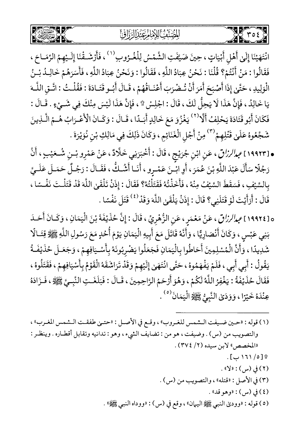 ° [١٩٩٢٤] عبد الرزاق، عَنْ مَعْمَرٍ، عَنِ الزُّهْرِيِّ، قَالَ: إِنَّ حُذَيْفَةَ بْنَ الْيَمَانِ، وَكَانَ أَحَدَ بَنِي عَبْسٍ، وَكَانَ أَنْصَارِيًّا، وَأَنَّهُ قَاتَلَ مَعَ أَبِيهِ الْيَمَانِ يَوْمَ أُحُدٍ مَعَ رَسُولِ اللَّهِ - صلى الله عليه وسلم - قِتَالًا شَدِيدًا، وَأَنَّ الْمُسْلِمِينَ أَحَاطُوا بِالْيَمَانِ فَجَعَلُوا يَضْرِبُونَهُ بِأَسْيَافِهِمْ، وَجَعَلَ حُذَيْفَةُ يَقُولُ: أَبِي أَبِي، فَلَمْ يَفْهَمُوه، حَتَّى انْتَهَى إِلَيْهِمْ وَقَدْ تَرَاشَقَهُ الْقَوْمُ بِأَسْيَافِهِمْ، فَقَتَلُوه، فَقَالَ حُذَيْفَةُ: يَغْفِرُ اللَّهُ لكُمْ، وَهُوَ أَرْحَمُ الرَّاحِمِينَ، قَالَ: فَبَلَغَتِ النَّبِيَّ - صلى الله عليه وسلم -، فَزَادَهُ عَنْدَهُ خَيْرًا، وَوَدَى النَّبِيُّ - صلى الله عليه وسلم - الْيَمَانَ (¬٥).