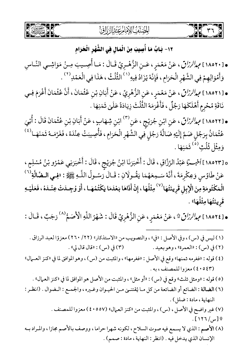 • [١٨٥٢٢] عبد الرزاق، عَنِ ابْنِ جُرَيْجٍ، عَنِ (¬٣) ابْنِ شِهَابٍ، عَنْ أَبَانِ بْنِ عُثْمَانَ قَالَ: أُتِيَ عُثْمَانُ بِرَجُلٍ ضَمَّ إِلَيْهِ ضَالَّةَ رَجُلٍ فِي الشَّهْرِ الْحَرَامِ، فَأُصِيبَتْ عِنْدَهُ، فَغَرَّمَهُ ثَمَنَهَا (¬٤) وَمِثْلَ ثُلُثِ (¬٥) ثَمَنِهَا.