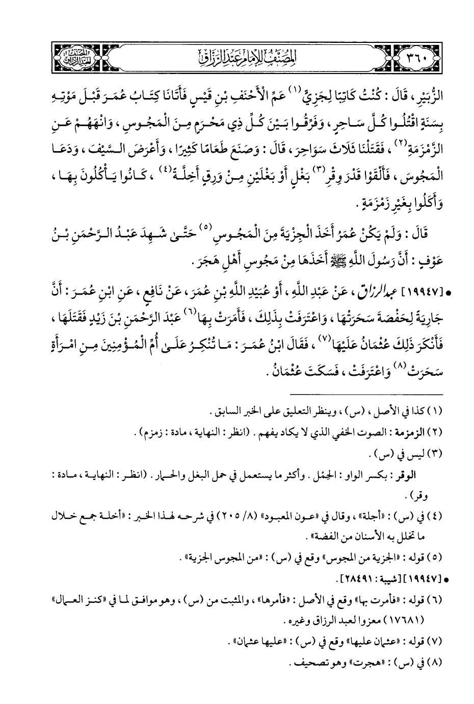 الزُّبَيْرِ، قَالَ: كُنْتُ كَاتِبًا لِجَزِيٍّ (¬١) عَمِّ الْأَحْنَفِ بْنِ قَيْسٍ فَأَتَانَا كِتَابُ عُمَرَ قَبْلَ مَوْتِهِ بِسَنَةٍ اقْتُلُوا كُلَّ سَاحِرٍ، وَفَرِّقُوا بَيْنَ كُلِّ ذِي مَحْرَمٍ مِنَ الْمَجُوسِ، وَانْهَهُمْ عَنِ الزَّمْزَمَةِ (¬٢)، فَقَتَلْنَا ثَلَاثَ سَوَاحِرَ، قَالَ: وَصَنَعَ طَعَامًا كَثِيرًا، وَأَعْرَضَ السَّيْفَ، وَدَعَا الْمَجُوسَ، فَأَلْقَوْا قَدْرَ وِقْرِ (¬٣) بَغْلٍ أَوْ بَغْلَيْنِ مِنْ وَرِقٍ أَخِلَّةً (¬٤)، كَانُوا يَأْكُلُونَ بِهَا، وَأَكَلُوا بِغَيْرِ زَمْزَمَةٍ.