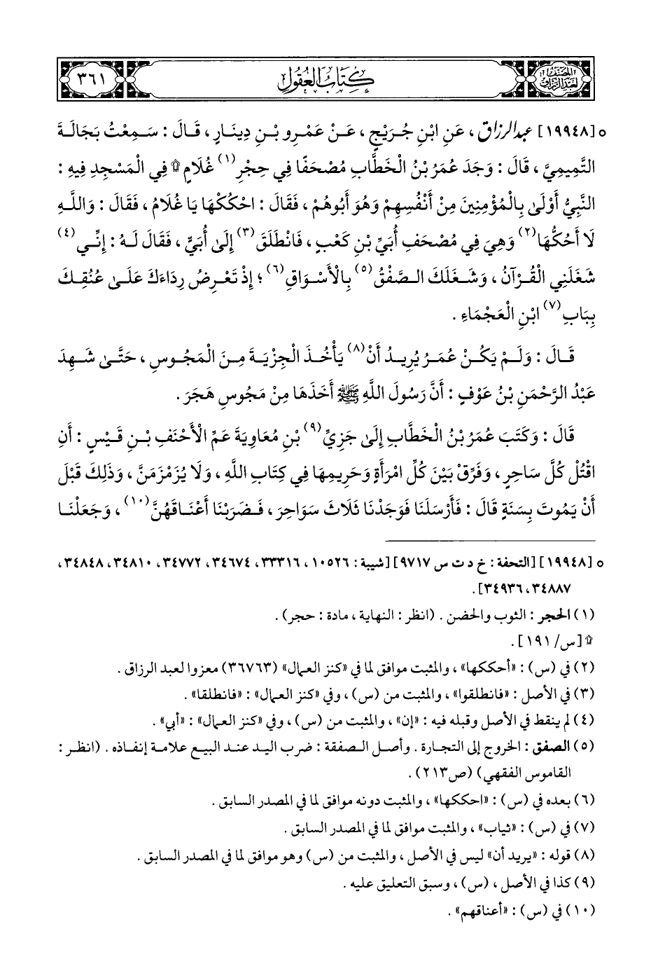 ° [١٩٩٤٨] عبد الرزاق، عَنِ ابْنِ جُرَيْجٍ، عَنْ عَمْرِو بْنِ دِينَارٍ، قَالَ: سَمِعْتُ بَجَالَةَ التَّمِيمِيَّ، قَالَ: وَجَدَ عُمَرُ بْنُ الْخَطَّابِ مُصْحَفًا فِي حِجْرِ (¬١) غُلَامٍ * فِي الْمَسْجِدِ فِيهِ: النَّبِيُّ أَوْلَى بِالْمُؤْمِنِينَ مِنْ أَنْفُسِهِمْ وَهُوَ أَبُوهُمْ، فَقَالَ: احْكُكْهَا يَا غُلَام، فَقَالَ: وَاللَّهِ لَا أَحُكُّهَا (¬٢) وَهِيَ فِي مُصْحَفِ أُبَيِّ بْنِ كَعْبٍ، فَانْطَلَقَ (¬٣) إِلَى أُبَيٍّ، فَقَالَ لَهُ: إِنِّي (¬٤) شَغَلَنِي الْقُرْآن، وَشَغَلَكَ الصَّفْقُ (¬٥) بِالْأَسْوَاقِ (¬٦)؛ إِذْ تَعْرِضُ رِدَاءَكَ عَلَى عُنُقِكَ بِبَابِ (¬٧) ابْنِ الْعَجْمَاءِ.