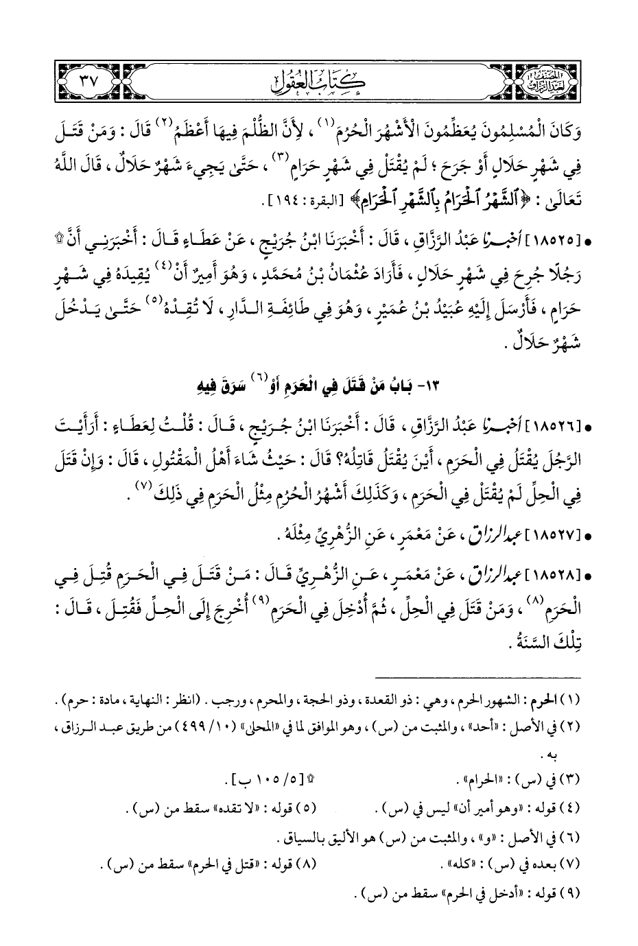 • [١٨٥٢٦] أخبرنا عَبْدُ الرَّزَّاقِ، قَالَ: أَخْبَرَنَا ابْنُ جُرَيْجٍ، قَالَ: قُلْتُ لِعَطَاءٍ: أَرَأَيْتَ الرَّجُلَ يُقْتَلُ فِي الْحَرَمِ، أَيْنَ يُقْتَلُ قَاتِلُهُ؟ قَالَ: حَيْثُ شَاءَ أَهْلُ الْمَقْتُولِ، قَالَ: وإِنْ قَتَلَ فِي الْحِلِّ لَمْ يُقْتَلْ فِي الْحَرَمِ، وَكَذَلِكَ أَشْهُرُ الْحُرُمِ مِثْلُ الْحَرَمِ فِي ذَلِكَ (¬٧).