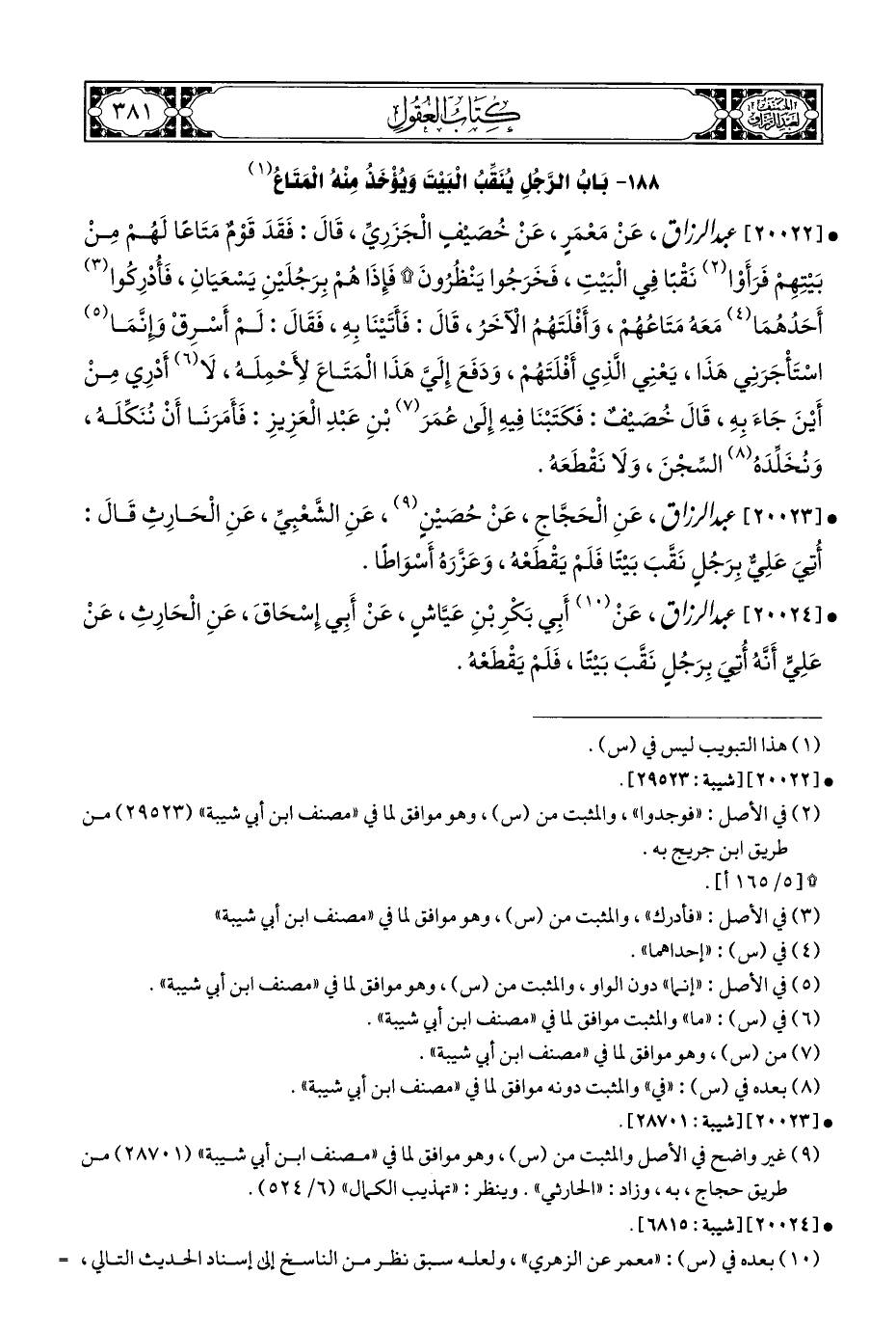 • [٢٠٠٢٣] عبد الرزاق، عَنِ الْحَجَّاجِ، عَنْ حُصَيْنٍ (¬٩)، عَنِ الشَّعْبِيِّ، عَنِ الْحَارِثِ قَالَ: أُييَ عَلِيٌّ بِرَجُلٍ نَقَّبَ بَيْتًا فَلَمْ يَقْطَعْه، وَعَزَّرَهُ أَسْوَاطًا.