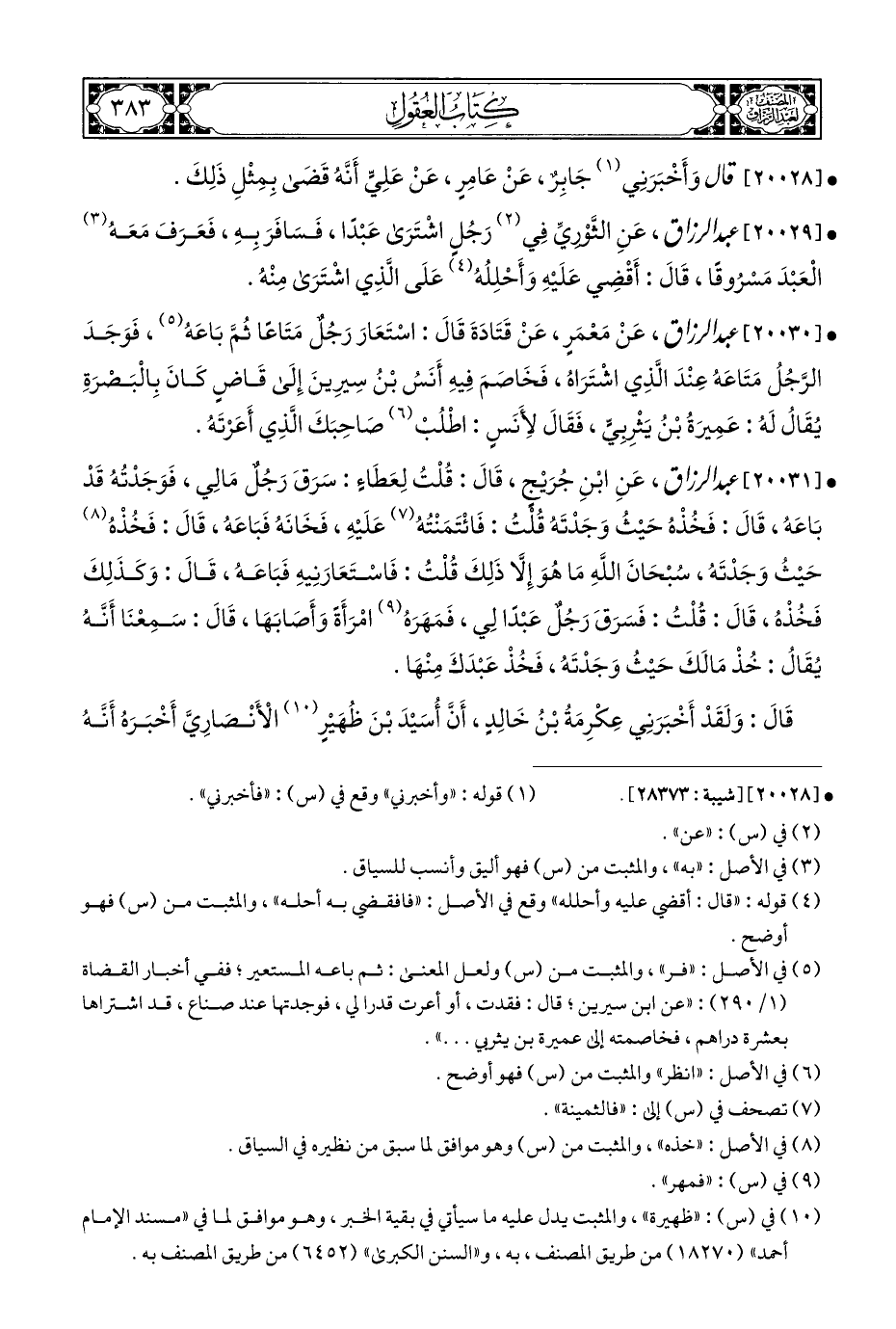 • [٢٠٠٢٩] عبد الرزاق، عَنِ الثَّوْريِّ فِي (¬٢) رَجُلٌ اشْتَرَى عَبْدًا، فَسَافَرَ بِهِ، فَعَرَفَ مَعَهُ (¬٣) الْعَبْدَ مَسْرُوقًا، قَالَ: أَقْضِي عَلَيْهِ وَأَحْلِلُهُ (¬٤) عَلَى الَّذِي اشْتَرَى مِنْهُ.