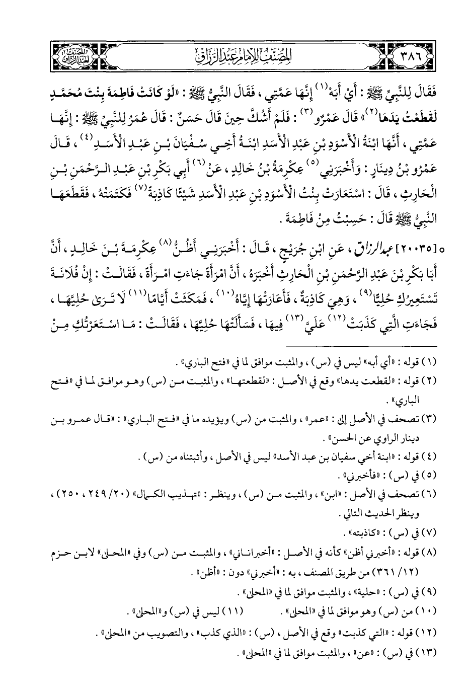 فَقَالَ لِلنَّبِيِّ - صلى الله عليه وسلم -: أَيْ أَبَهْ (¬١) إِنَّهَا عَمَّتِي، فَقَالَ النَّبِيُّ - صلى الله عليه وسلم -: "لَوْ كَانَتْ فَاطِمَةَ بِنْتَ مُحَمَّدٍ لَقَطَعْتُ يَدَهَا (¬٢) " قَالَ عَمْرٌو (¬٣): فَلَمْ أَشُكَّ حِينَ قَالَ حَسَنٌ: قَالَ عُمَرُ لِلنَّبِيِّ - صلى الله عليه وسلم -: إِنَّهَا عَمَّتِي، أَنَّهَا ابْنَةُ الْأَسْوَدِ بْنِ عَبْدِ الْأَسَدِ ابْنَةُ أَخِي سُفْيَانَ بْنِ عَبْدِ الْأَسَدِ (¬٤)، قَالَ عَمْرُو بْنُ دِينَارٍ: وَأَخْبَرَنِي (¬٥) عِكْرِمَةُ بْنُ خَالِدٍ، عَنْ (¬٦) أَبِي بَكْرِ بْنِ عَبْدِ الرَّحْمَنِ بْنِ الْحَارِثِ، قَالَ: اسْتَعَارَتْ بِنْتُ الْأَسْوَدِ بْنِ عَبْدِ الْأَسَدِ شَيْئًا كَاذِبَةً (¬٧) فَكَتَمَتْه، فَقَطَعَهَا النَّبِيُّ - صلى الله عليه وسلم - قالَ: حَسِبْتُ مِنْ فَاطِمَةَ.