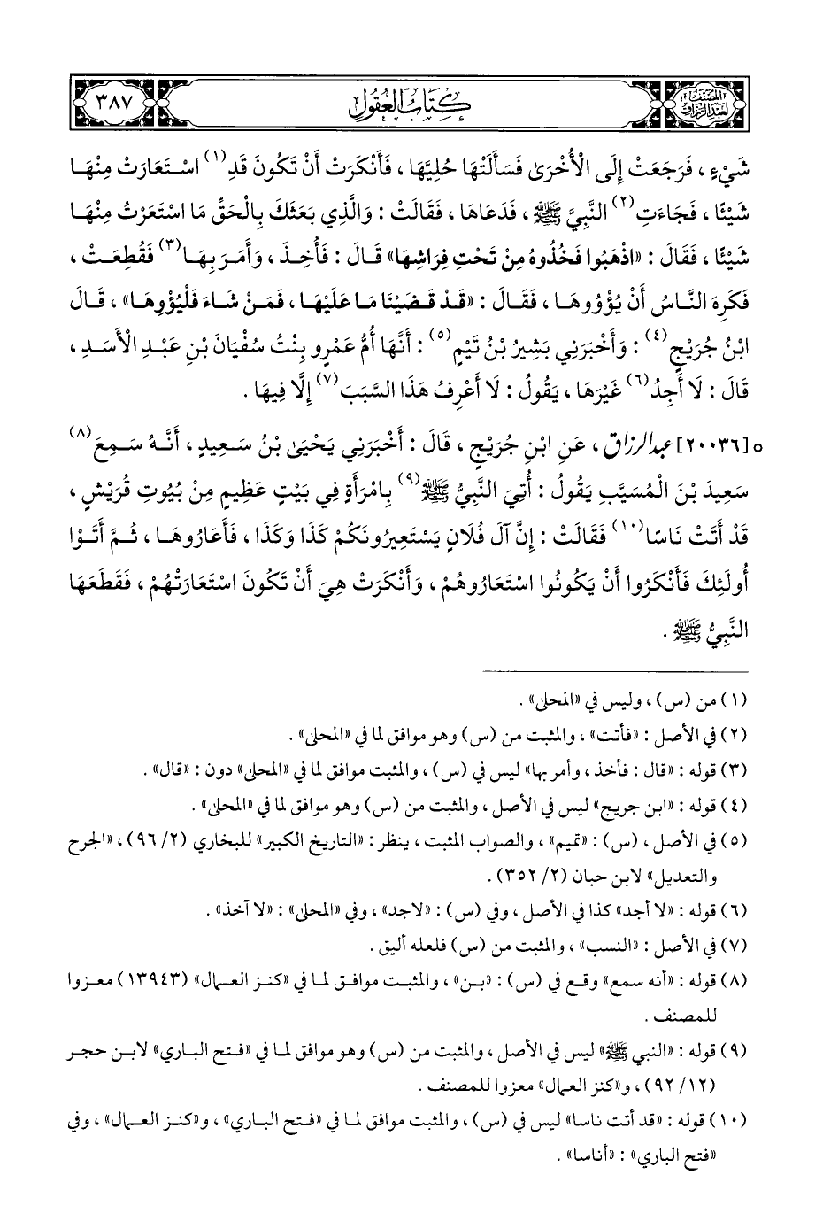 ° [٢٠٠٣٦] عبد الرزاق، عَنِ ابْنِ جُرَيْجٍ، قَالَ: أَخْبَرَنِي يَحْيَى بْنُ سَعِيدٍ، أَنَّهُ سَمِعَ (¬٨) سَعِيدَ بْنَ الْمُسَيَّبِ يَقُولُ: أُتِيَ النَّبِيُّ - صلى الله عليه وسلم - (¬٩) بِامْرَأَةٍ فِي بَيْتٍ عَظِيمٍ مِنْ بُيُوتِ قُرَيْشٍ، قَدْ أَتَتْ نَاسًا (¬١٠) فَقَالَتْ: إِنَّ آلَ فُلَانٍ يَسْتَعِيرُونَكُمْ كَذَا وَكَذَا، فَأَعَارُوهَا، ثُمَّ أَتَوْا أُولَئِكَ فَأَنْكَرُوا أَنْ يَكُونُوا اسْتَعَارُوهُمْ، وَأَنْكَرَتْ هِيَ أَنْ تَكُونَ اسْتَعَارَتْهُمْ، فَقَطَعَهَا النَّبِيُّ - صلى الله عليه وسلم -.