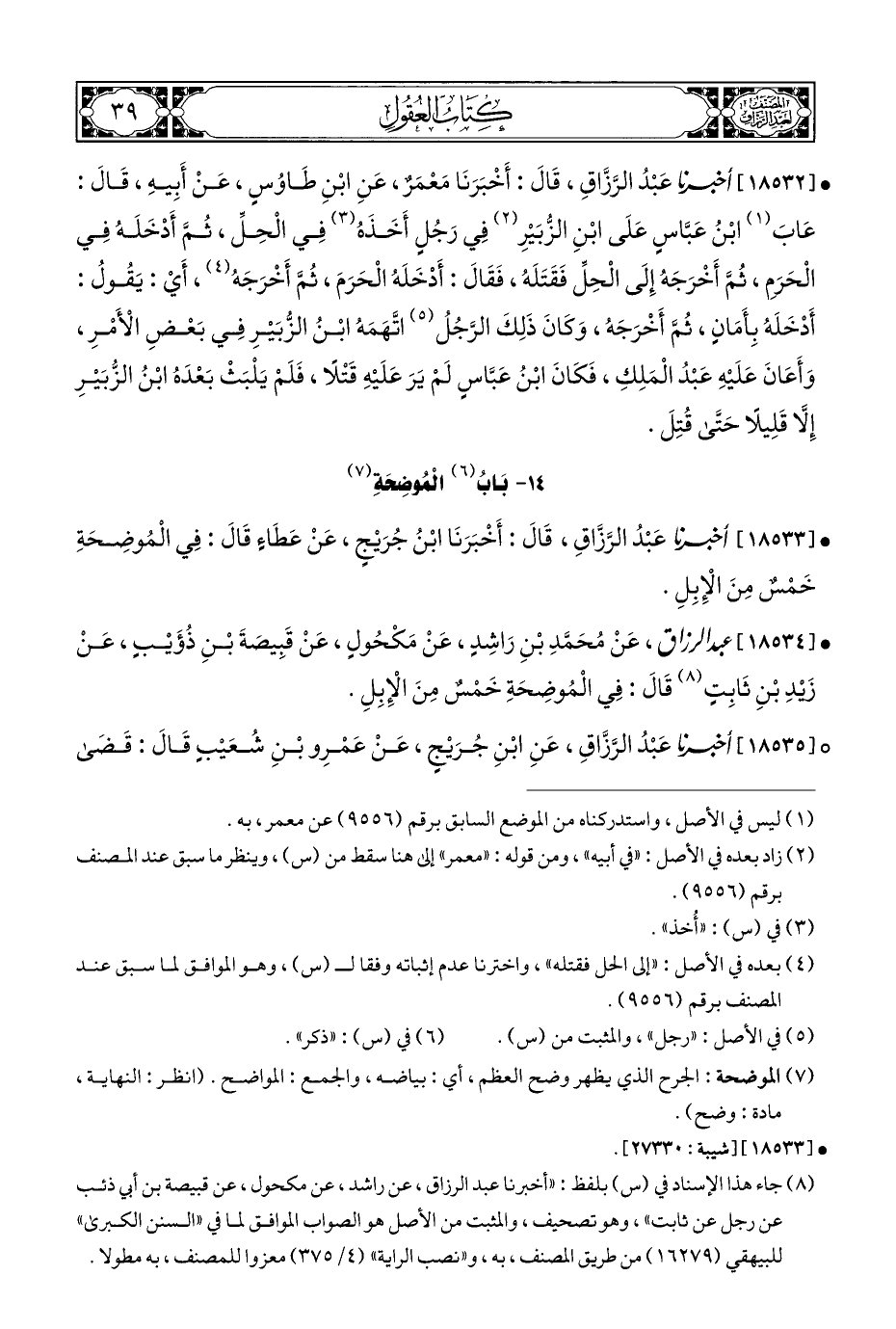 • [١٨٥٣٤] عبد الرزاق، عَنْ مُحَمَّدِ بْنِ رَاشِدٍ، عَنْ مَكْحُولٍ، عَنْ قَبِيصَةَ بْنِ ذُؤَيْبٍ، عَنْ زَيْدِ بْنِ ثَابِتٍ (¬٨) قَالَ: فِي الْمُوضِحَةِ خَمْسٌ مِنَ الْإِبِلِ.