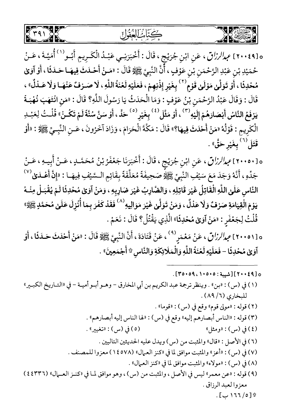 ° [٢٠٠٤٩] عبد الرزاق، عَنِ ابْنِ جُرَيْجٍ، قَالَ: أَخْبَرَنِي عَبْدُ الْكَرِيمِ أَبُو (¬١) أُمَيَّةَ، عَنْ حُمَيْدِ بْنِ عَبْدِ الرَّحْمَنِ بْنِ عَوْفٍ، أنَّ النَّبِيَّ - صلى الله عليه وسلم - قالَ: "مَنْ أَحْدَثَ فِيهَا حَدَثًا، أَوْ آوَى مُحْدِثًا، أَوْ تَوَلَّى مَوْلَى قَوْمٍ (¬٢) بِغَيْرِ إِذْنِهِمْ، فَعَلَيْهِ لَعْنَةُ اللَّهِ، لَا صَرْفٌ عَنْهَا وَلَا عَدْلٌ"، قَالَ: وَقَالَ عَبْدُ الرَّحْمَنِ بْنُ عَوْفٍ: وَمَا الْحَدَثُ يَا رَسُولَ اللَّهِ؟ قَالَ: "مَنِ انْتَهَبَ نُهْبَةً يَرْفَعُ النُّاسُ أَبْصَارَهُمْ إِلَيْهِ (¬٣)، أَوْ مَئَّلَ (¬٤) بِغَيْرِ (¬٥) حَدٍّ، أَوْ سَنَّ سُنَّةً لَمْ تَكُنْ" قُلْتُ لِعَبْدِ الْكَرِيمِ: قَوْلُهُ "مَنْ أَحْدَثَ فِيهَا؟ " قَالَ: مَكَّةَ الْحَرَامَ، وَزَادَ آخَرُونَ، عَنِ النَّبِيِّ - صلى الله عليه وسلم -: "أَوْ قَتَلَ (¬٦): بِغَيْرِ حَقٍّ".