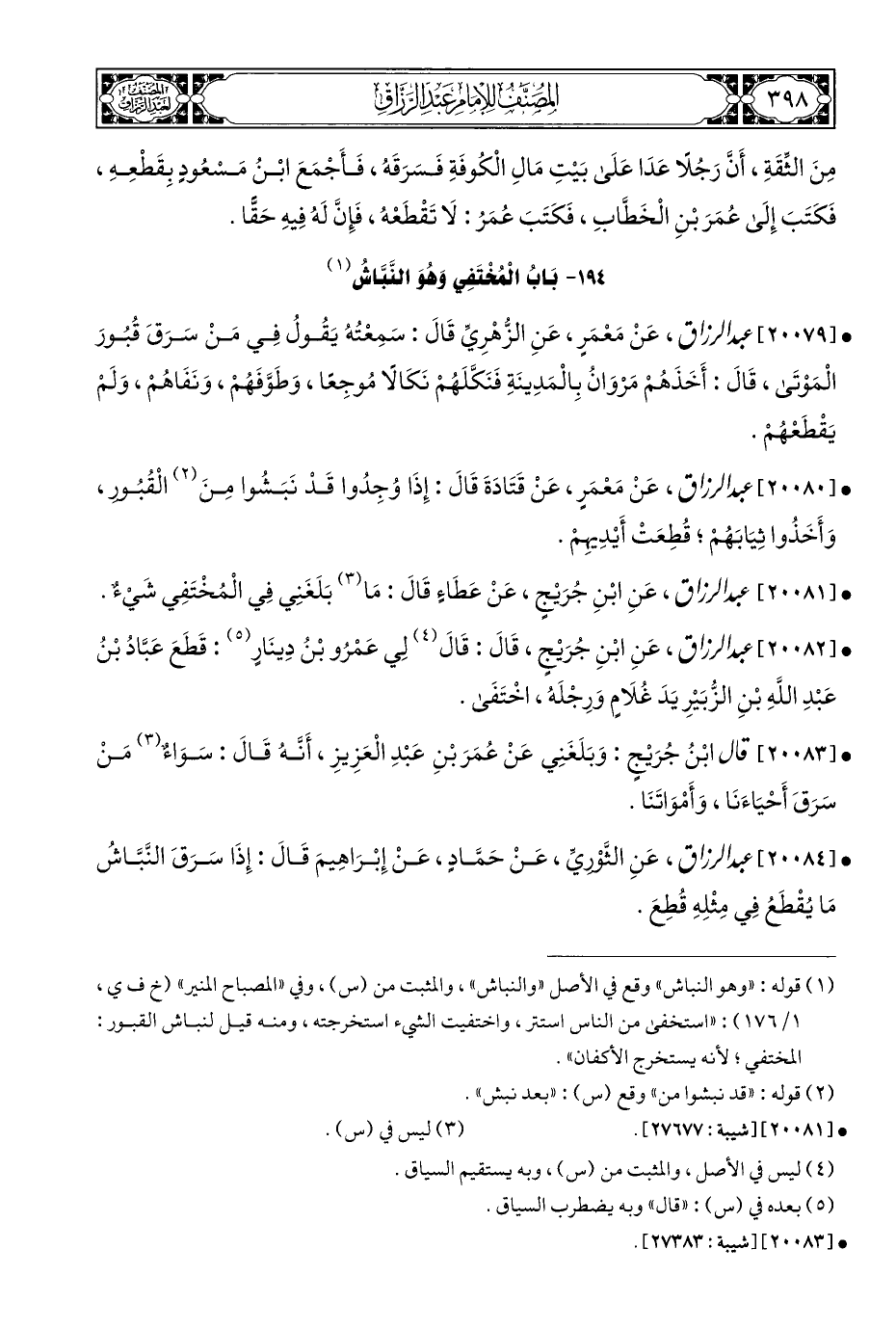 • [٢٠٠٨٠] عبد الرزاق، عَنْ مَعْمَرٍ، عَنْ قَتَادَةَ قَالَ: إِذَا وُجِدُوا قَدْ نَبَشُوا مِنَ (¬٢) الْقُبُورِ، وَأَخَذُوا ثِيَابَهُمْ؛ قُطِعَتْ أَيْدِيهِمْ.