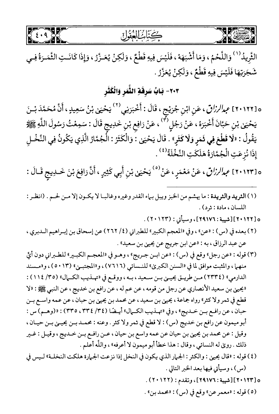 ° [٢٠١٢٢] عبد الرزاق، عَنِ ابْنِ جُرَيْجٍ، قَالَ: أَخْبَرَنِي (¬٢) يَحْيَى بْنُ سَعِيدٍ، أَنَّ مُحَمَّدَ بْنَ يَحْيَى بْنِ حَبَّانَ أَخْبَرَه، عَنْ رَجُلٍ (¬٣)، عَنْ رَافِعِ بْنِ خَدِيجٍ قَالَ: سَمِعْتُ رَسُولَ اللَّهِ - صلى الله عليه وسلم - يَقُولُ: "لَا قَطْعَ فِي ثَمَرٍ وَلَا كَثَرٍ". قَالَ يَحْيَى: وَالْكَثَرُ: الْجُمَّارُ الَّذِي يَكُونُ فِي النَّخْلِ إِذَا نُزِعَتِ الْجُمَّارَةُ هَلَكَتِ النَّخْلَةُ (¬٤).