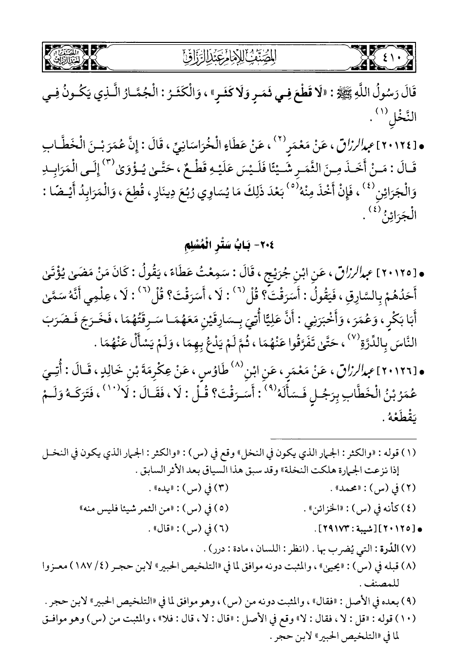 • [٢٠١٢٤] عبد الرزاق، عَنْ مَعْمَرٍ (¬٢)، عَنْ عَطَاءٍ الْخُرَاسَانِيِّ، قَالَ: إِنَّ عُمَرَ بْنَ الْخَطَّابِ قَالَ: مَنْ أَخَذَ مِنَ الثَّمَرِ شَيْئًا فَلَيْسَ عَلَيْهِ قَطْعٌ، حَتَّى يُؤْوَى (¬٣) إِلَى الْمَرَابِدِ وَالْجَرَائِنِ (¬٤)، فَإِنْ أَخْذَ مِنْهُ (¬٥) بَعْدَ ذَلِكَ مَا يُسَاوِي رُبُعَ دِينَارٍ، قُطِعَ، وَالْمَرَابِدُ أَيْضًا: الْجَرَائِنُ (¬٤).