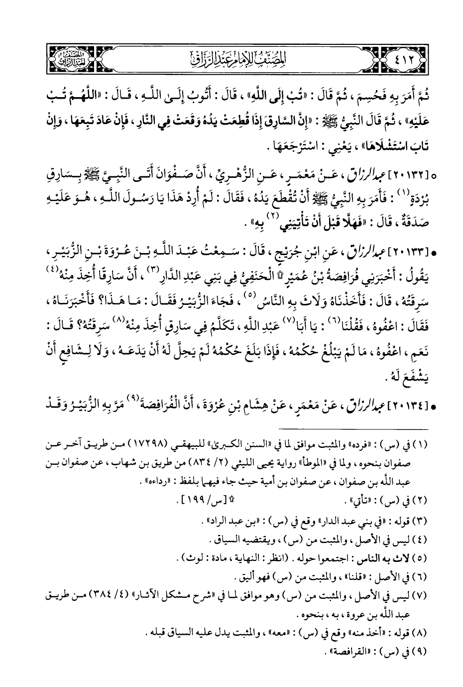 ° [٢٠١٣٢] عبد الرزاق، عَنْ مَعْمَرٍ، عَنِ الزُّهْرِيِّ، أَنَّ صَفْوَانَ أَتَى النَّبِيَّ - صلى الله عليه وسلم - بِسَارِقِ بُرْدَةٍ (¬١): فَأَمَرَ بِهِ النَّبِيُّ - صلى الله عليه وسلم - أَنْ تُقْطَعَ يَدُه، فَقَالَ: لَمْ أُرِدْ هَذَا يَا رَسُولَ اللَّهِ، هُوَ عَلَيْهِ صَدَقَةٌ، قَالَ: "فَهَلَّا قَبْلَ أَنْ تَأْتِيَنِي (¬٢) بِهِ".