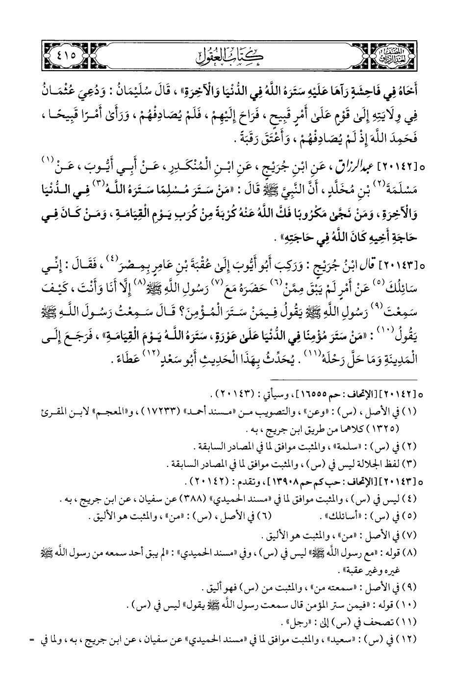 ° [٢٠١٤٣] قال ابْنُ جُرَيْجٍ: وَرَكِبَ أَبُو أَيُّوبَ إِلَى عُقْبَةَ بْنِ عَامِرٍ بِمِصْرَ (¬٤)، فَقَالَ: إِنِّي سَائِلُكَ (¬٥) عَنْ أَمْرٍ لَمْ يَبْقَ مِمَّنْ (¬٦) حَضَرَهُ مَعَ (¬٧) رَسُولِ اللَّهِ - صلى الله عليه وسلم - (¬٨) إِلَّا أَنَا وَأَنْتَ، كَيْفَ سَمِعْتَ (¬٩) رَسُولِ اللَّهِ - صلى الله عليه وسلم - يَقُولُ فِيمَنْ سَتَرَ الْمُؤْمِنَ؟ قَالَ سَمِعْتُ رَسُولَ اللَّهِ - صلى الله عليه وسلم - يَقُولُ (¬١٠): "مَنْ سَتَرَ مُؤْمِنًا فِي الدُّنْيَا عَلَى عَوْرَةٍ، سَتَرَهُ اللَّهُ يَوْمَ الْقِيَامَةِ"، فَرَجَعَ إِلَى الْمَدِينَةِ وَمَا حَلَّ رَحْلَهُ (¬١١). يُحَدِّثُ بِهَذَا الْحَدِيثِ أَبُو سَعْدٍ (¬١٢) عَطَاءً.
