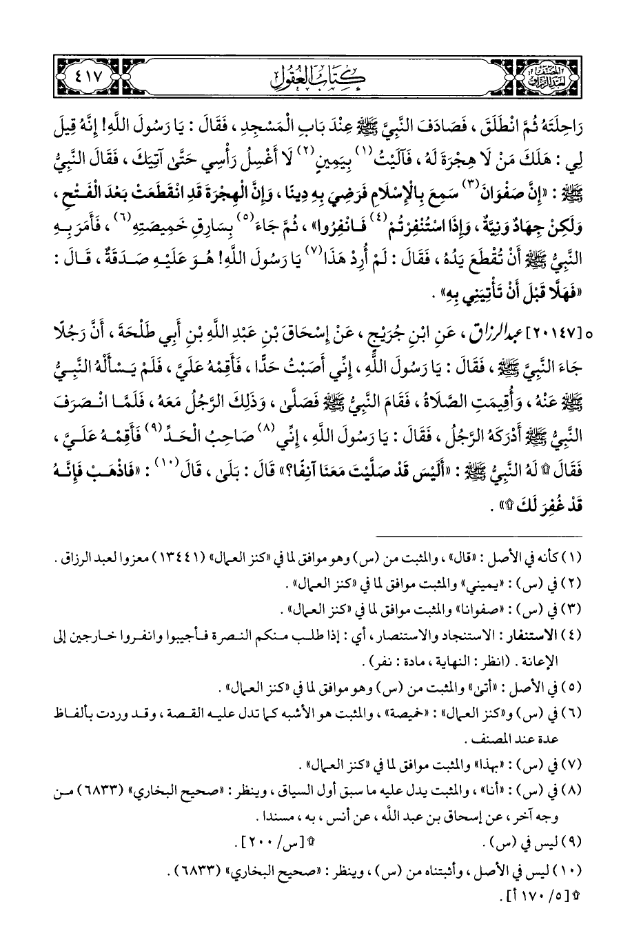 رَاحِلَتَهُ ثُمَّ انْطَلَقَ، فَصَادَفَ النَّبِيُّ - صلى الله عليه وسلم - عِنْدَ بَابِ الْمَسْجِدِ، فَقَالَ: يَا رَسُولَ اللَّهِ! إِنَّهُ قِيلَ لِي: هَلَكَ مَنْ لَا هِجْرَةَ لَه، فَآلَيْتُ (¬١) بِيَمِينٍ (¬٢) لَا أَغْسِلُ رَأْسِي حَتَّى آتِيَكَ، فَقَالَ النَّبِيُّ - صلى الله عليه وسلم -: "إِنَّ صَفْوَانَ (¬٣) سَمِعَ بِالْإِسْلَامِ فَرَضِيَ بِهِ دِينًا، وَإِنَّ الْهِجْرَةَ قَدِ انْقَطَعَتْ بَعْدَ الْفَتْحِ، وَلَكِنْ جِهَادٌ وَنِيَّةٌ، وإذَا اسْتُنْفِرْتُمْ (¬٤) فَانْفِرُوا"، ثُمَّ جَاءَ (¬٥) بسَارِقِ خَمِيصَتِهِ (¬٦)، فَأَمَرَ بِهِ النَّبِيُّ - صلى الله عليه وسلم - أنْ تُقْطَعَ يَدُه، فَقَالَ: لَمْ أُرِدْ هَذَا (¬٧) يَا رَسُولَ اللَّهِ! هُوَ عَلَيْهِ صَدَقَةٌ، قَالَ: "فَهَلَّا قَبْلَ أَنْ تَأْتِيَنِي بِهِ".