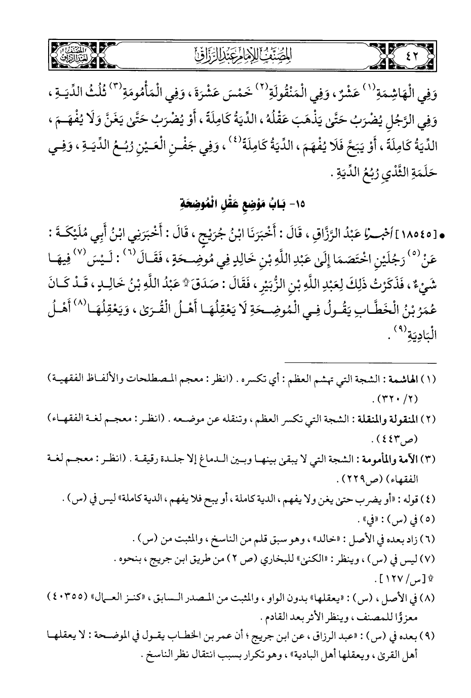(¬٩) بعده في (س): "عبد الرزاق، عن ابن جريج؛ أن عمر بن الخطاب يقول في الموضحة: لا يعقلها أهل القرى، ويعقلها أهل البادية"، وهو تكرار بسبب انتقال نظر الناسخ.