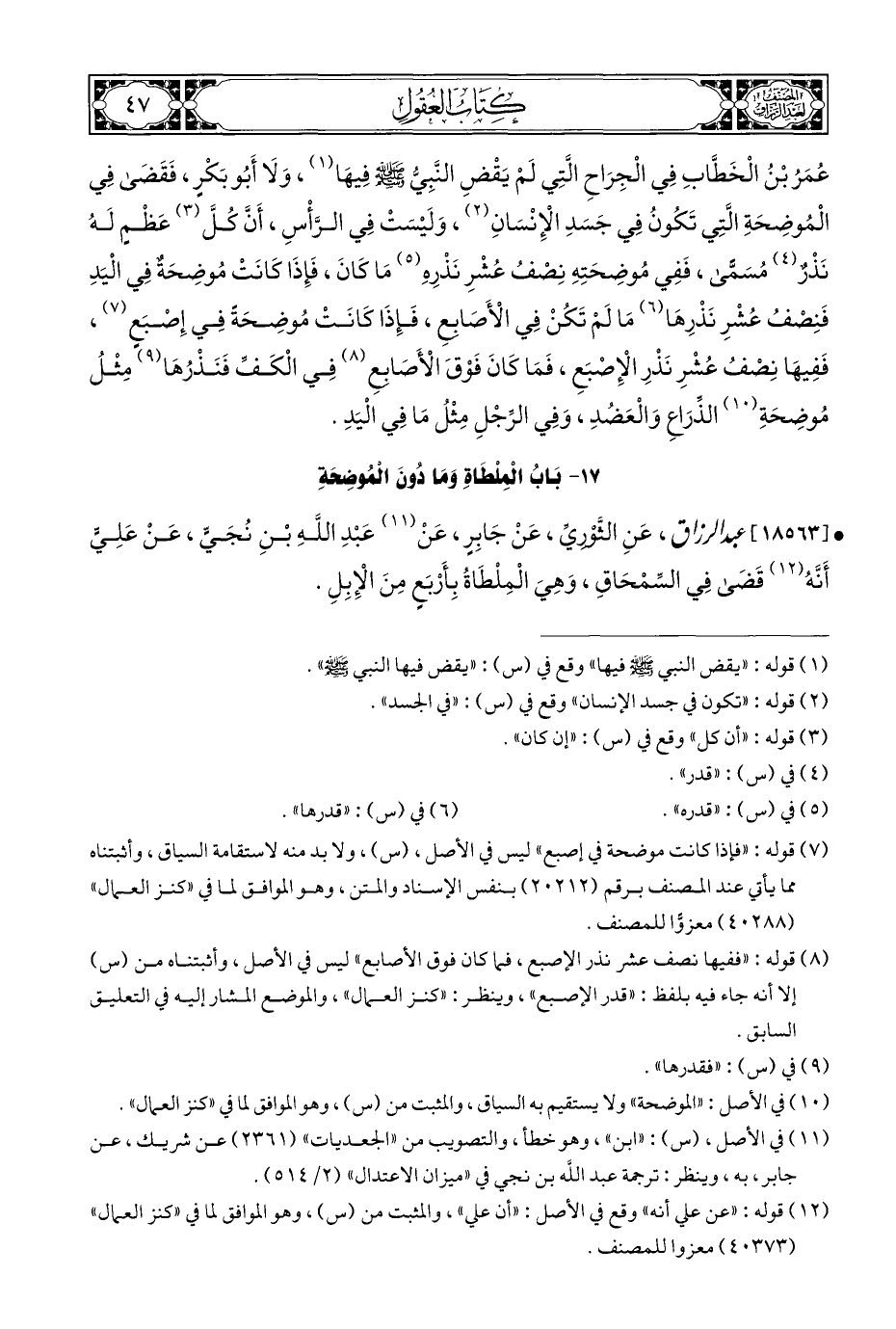 (¬٧) قوله: "فإذا كانت موضحة في إصبع" ليس في الأصل، (س)، ولا بد منه لاستقامة السياق، وأثبتناه مما يأتي عند المصنف برقم (٢٠٢١٢) بنفس الإسناد والمتن، وهو الموافق لما في "كنز العمال" (٤٠٢٨٨) معزوّا للمصنف.