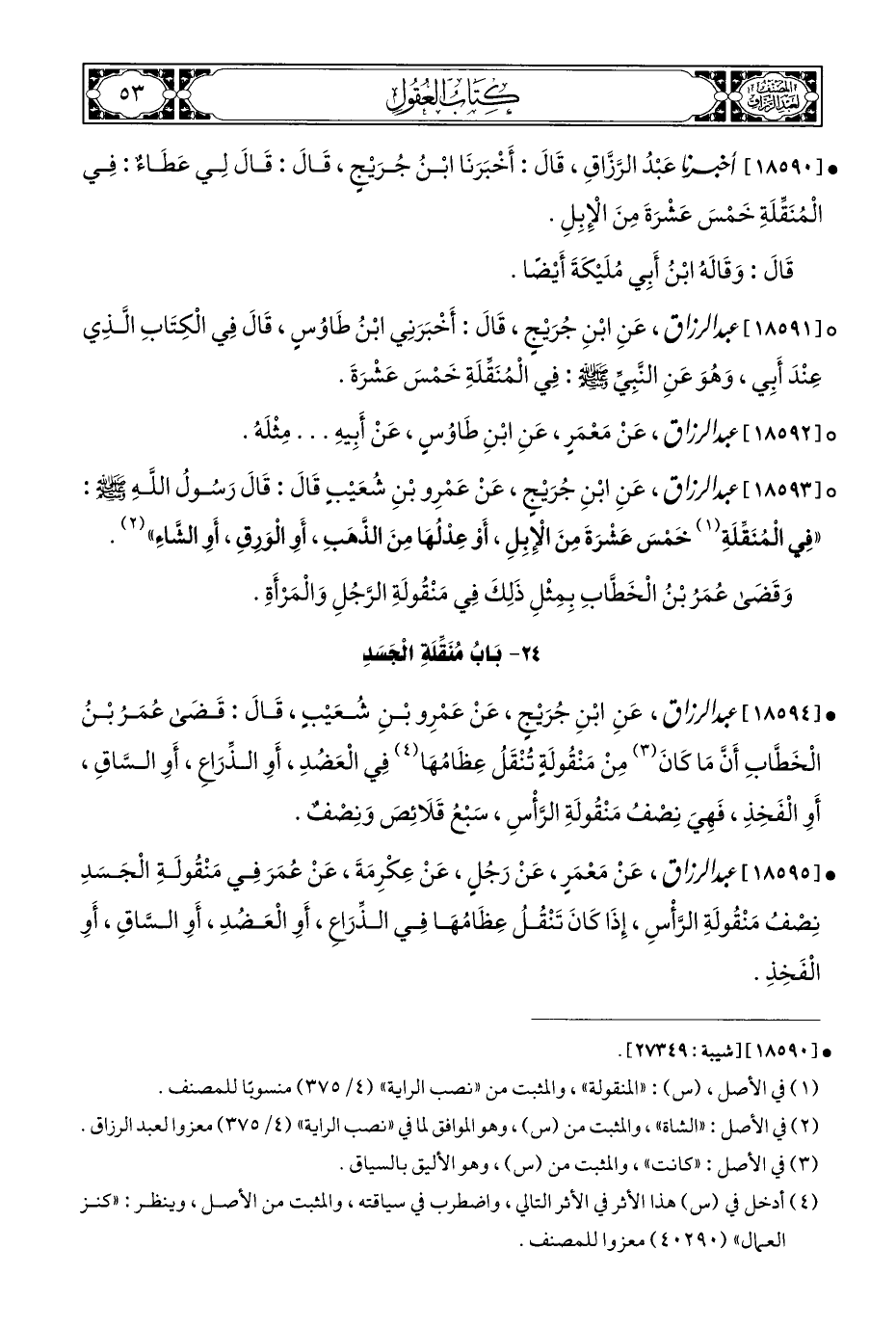 ° [١٨٥٩١] عبد الرزاق، عَنِ ابْنِ جُرَيْجٍ، قَالَ: أَخْبَرَنِي ابْنُ طَاوُسٍ، قَالَ فِي الْكِتَابِ الَّذِي عِنْدَ أَبِي، وَهُوَ عَنِ النَّبِيِّ - صلى الله عليه وسلم -: فِي الْمُنَقِّلَةِ خَمْسَ عَشْرَةَ.