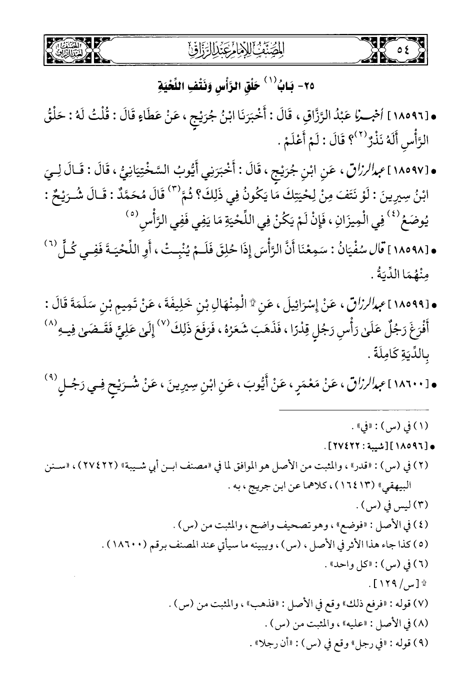• [١٨٥٩٧] عبد الرزاق، عَنِ ابْنِ جُرَيْجٍ، قَالَ: أَخْبَرَنِي أَيُّوبُ السَّخْتِيَانِيُّ، قَالَ: قَالَ لِيَ ابْنُ سِيرِينَ: لَوْ نَتَفَ مِنْ لِحْيَتِكَ مَا يَكُونُ فِي ذَلِكَ؟ ثُمَّ (¬٣) قَالَ مُحَمَّدٌ: قَالَ شُرَيْحٌ: يُوضعُ (¬٤) في المِيزَانِ، فَإِنْ لمْ يَكُنْ فِي اللحْيَةِ مَا يَفِي ففِي الرَّأْسِ (¬٥).