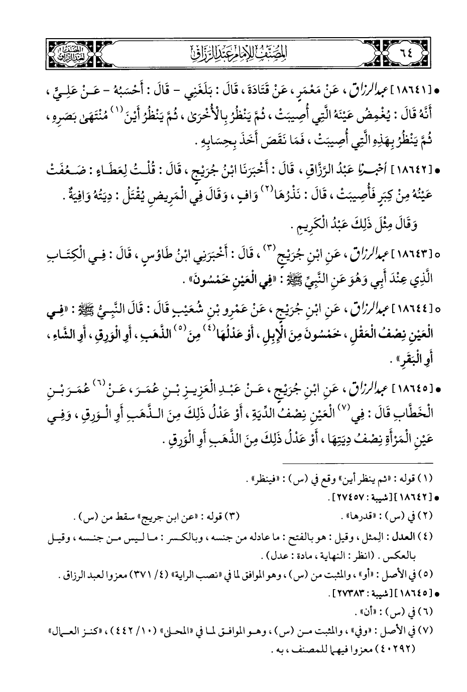 ° [١٨٦٤٣] عبد الرزاق، عَنِ ابْنِ جُرَيْجٍ (¬٣)، قَالَ: أَخْبَرَنِي ابْنُ طَاوُسٍ، قَالَ: فِي الْكِتَابِ الَّذِي عَنْدَ أَبِي وَهُوَ عَنِ النَّبِيِّ - صلى الله عليه وسلم -: "فِي الْعَيْنِ خَمْسُونَ".
