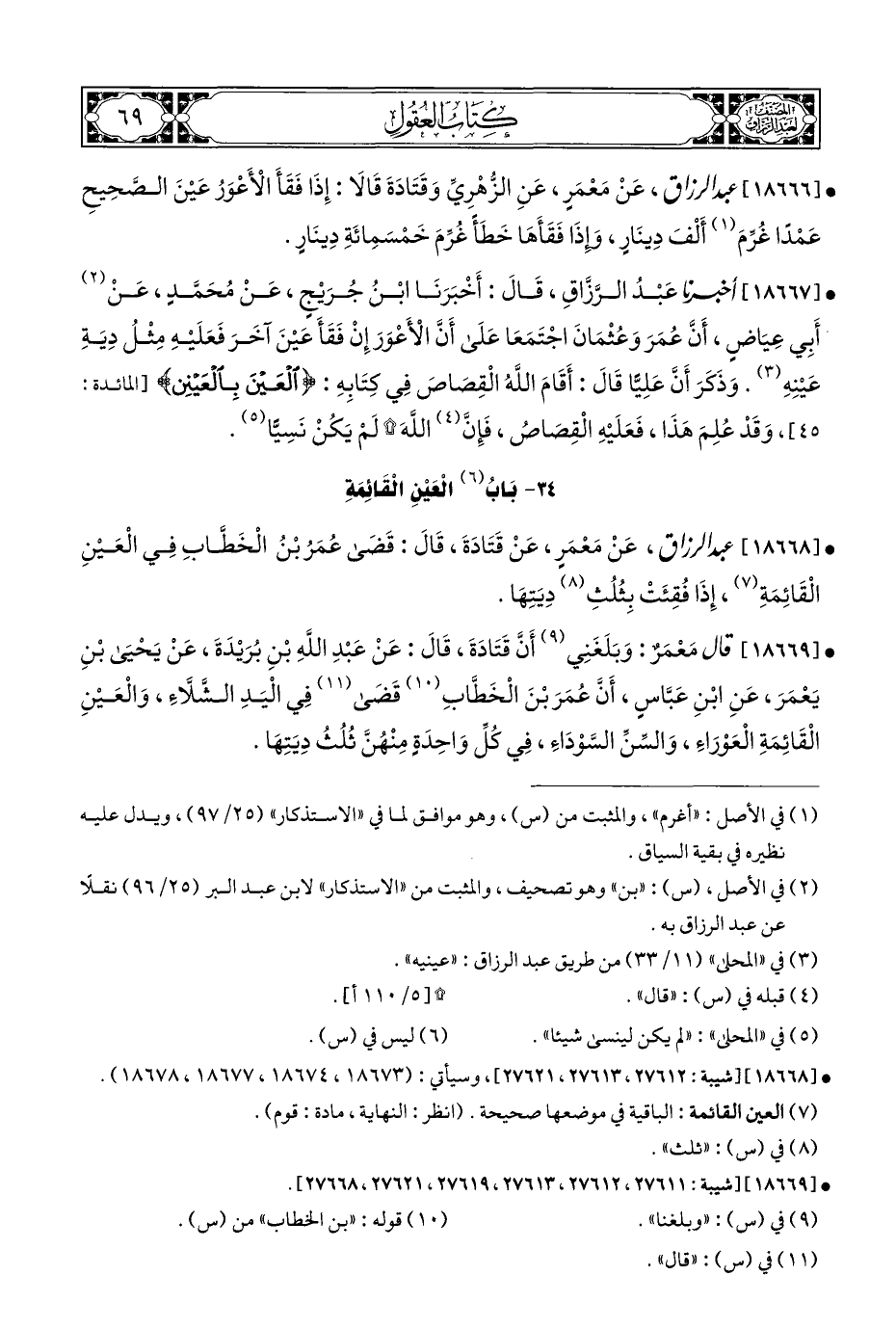 • [١٨٦٦٩] قال مَعْمَرٌ: وَبَلَغَنِي (¬٩) أَنَّ قَتَادَةَ، قَالَ: عَنْ عَبْدِ اللَّهِ بْنِ بُرَيْدَةَ، عَنْ يَحْيَى بْنِ يَعْمَرَ، عَنِ ابْنِ عَبَّاسٍ، أَنَّ عُمَرَ بْنَ الْخَطَّابِ (¬١٠) قَضى (¬١١) فِي الْيَدِ الشَّلَّاءِ، وَالْعَيْنِ الْقَائِمَةِ الْعَوْرَاءِ، وَالسِّنِّ السَّوْدَاءِ، فِي كُلِّ وَاحِدَةٍ مِنْهُنَّ ثُلُثُ دِيَتِهَا.