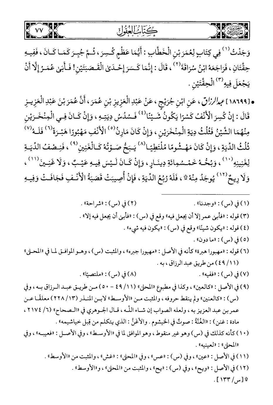 • [١٨٦٩٩] عبد الرزاق، عَنِ ابْنِ جُرَيْجٍ، عَنْ عَبْدِ الْعَزِيزِ بْنِ عُمَرَ، أَنَّ عُمَرَ بْنَ عَبْدِ الْعَزِيزِ قَالَ: إِنْ كُسِرَ الْأَنْفُ كَسْرًا يَكُونُ شَيْنًا (¬٤) فَسُدُسُ دِيَتِهِ، وإِنْ كَانَ فِي الْمِنْخَرَيْنِ مِنْهُمَا الشَّيْنُ فَثُلُثُ دِيَةِ الْمِنْخَرَيْنِ، وإِنْ كَانَ مَارِنُ (¬٥) الْأَنْفِ مَهْبُورًا هَبْرَةً (¬٦) فَلَهُ (¬٧) ثُلُثُ الدِّيَةِ، وإِنْ كَانَ مَهْشُومًا مُلْتَطِيًا (¬٨) يَبَحُّ صَوْتُهُ كَالْغَنِينِ (¬٩)، فَنِصْفُ الدِّيَةِ لِغَنِينِهِ (¬١٠) وَبُحُّهُ خَمْسُمِائَةِ دِينَار، وَإنْ كَانَ لَيْسَ فِيهِ عَيْبٌ، وَلَا غَنِينَ (¬١١)، وَلَا رِيحٌ (¬١٢) يُوجَدُ مِنْهُ *، فَلَهُ رُبُعُ الدِّيَةِ، فَإِنْ أُصِيبَتْ قَصَبَةُ الْأَنْفِ فَجَافَتْ وَفِيهِ