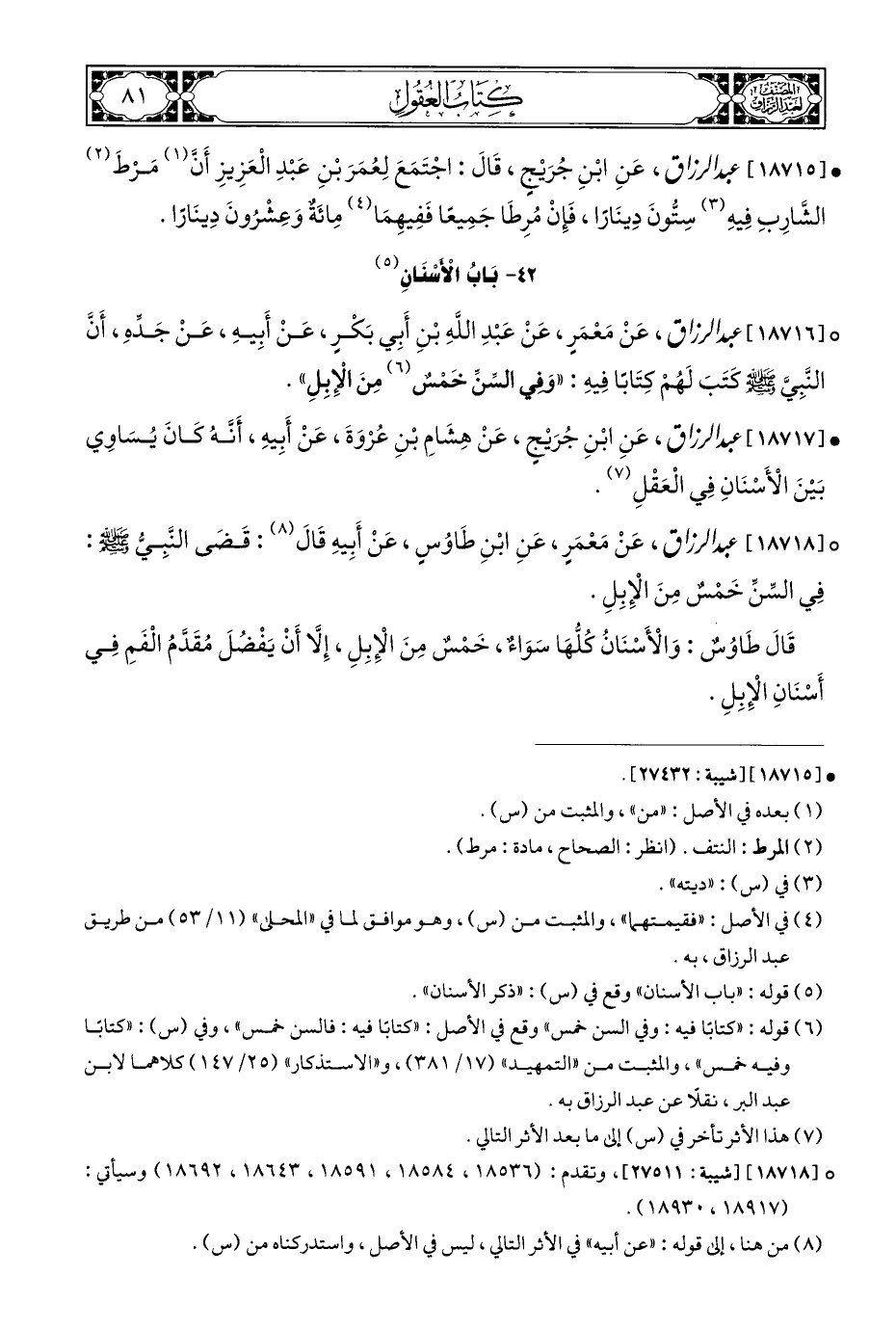 (¬٦) قوله: "كتابًا فيه: وفي السن خمس" وقع في الأصل: "كتابًا فيه: فالسن خمس"، وفي (س): "كتابًا وفيه خمس"، والمثبت من "التمهيد" (١٧/ ٣٨١)، و"الاستذكار" (٢٥/ ١٤٧) كلاهما لابن عبد البر، نقلًا عن عبد الرزاق به.