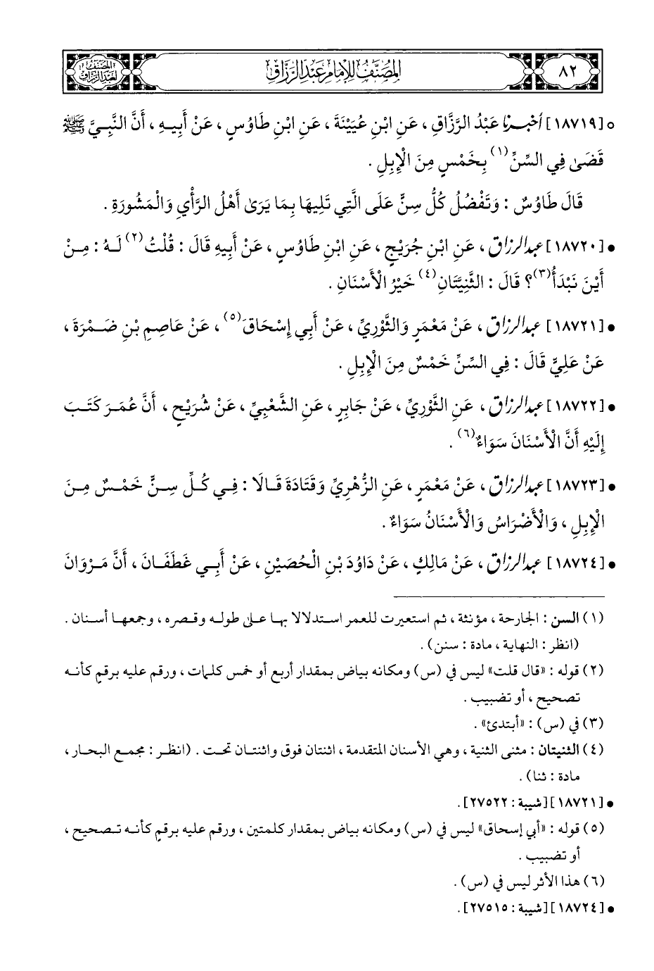 ° [١٨٧١٩] أخبرنا عَبْدُ الرَّزَّاقِ، عَنِ ابْنِ عُيَيْنَةَ، عَنِ ابْنِ طَاوُسٍ، عَنْ أَبِيهِ، أَنَّ النَّبِيَّ - صلى الله عليه وسلم - قَضَى فِي السّنِّ (¬١) بِخَمْسٍ مِنَ الْإِبِلِ.