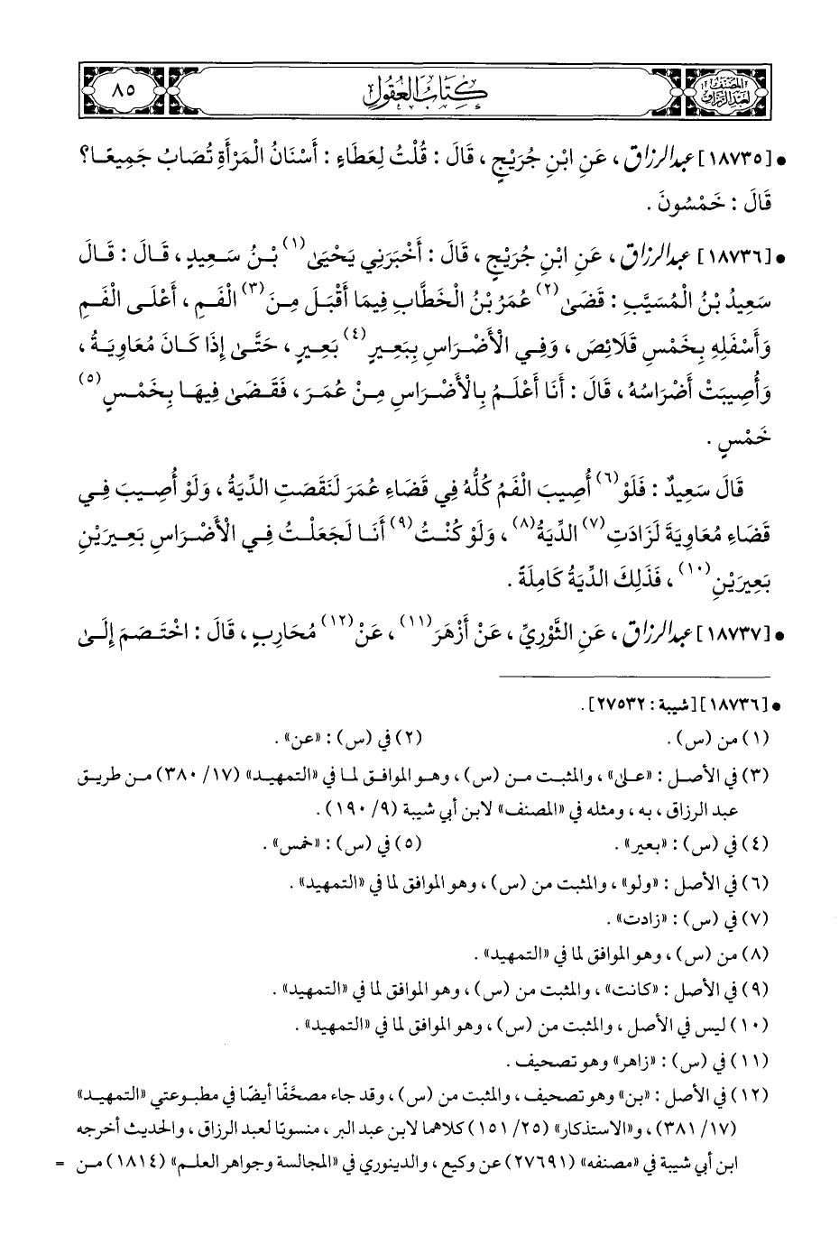 (¬١٢) في الأصل: "بن" وهو تصحيف، والمثبت من (س)، وقد جاء مصحَّفًا أيضًا في مطبوعتي "التمهيد" (١٧/ ٣٨١)، و"الاستذكار" (٢٥/ ١٥١) كلاهما لابن عبد البر، منسوبًا لعبد الرزاق، والحديث أخرجه ابن أبي شيبة في "مصنفه" (٢٧٦٩١) عن وكيع، والدينوري في "المجالسة وجواهر العلم" (١٨١٤) من =