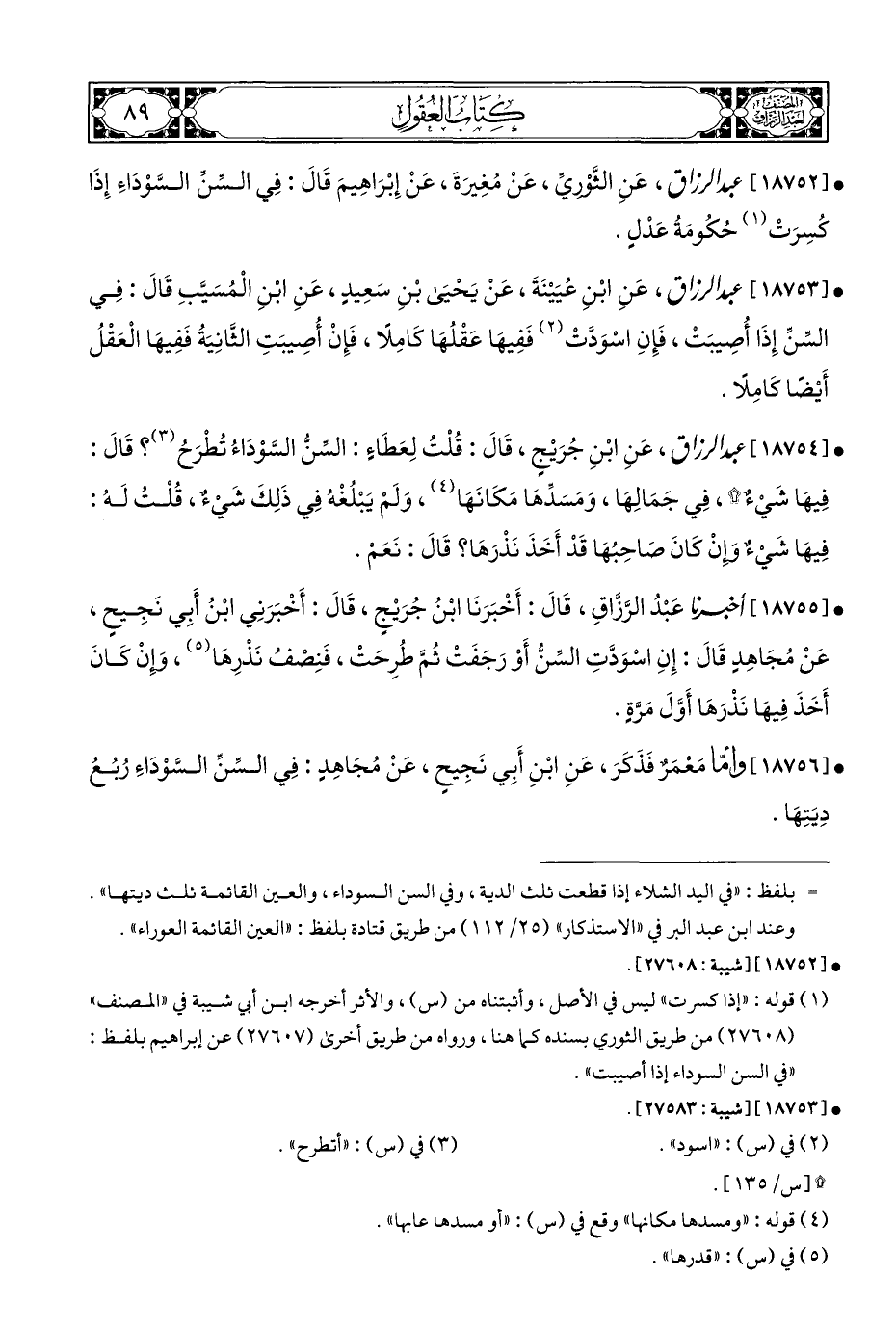 • [١٨٧٥٦] وأما مَعْمَرٌ فَذَكَرَ، عَنِ ابْنِ أَبِي نَجِيحٍ، عَنْ مُجَاهِدِ: فِي السِّنِّ السَّوْدَاءِ رُبُعُ دِيَتِهَا.
