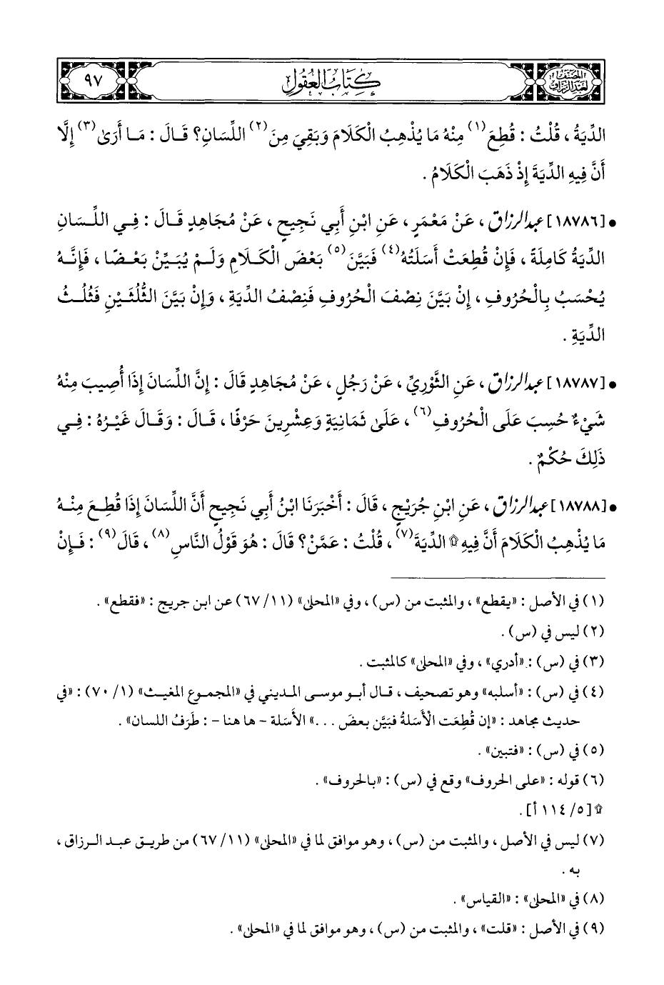 • [١٨٧٨٨] عبد الرزاق، عَنِ ابْنِ جُرَيْجٍ، قَالَ: أَخْبَرَنَا ابْنُ أَبِي نَجِيحٍ أَنَّ اللِّسَانَ إِذَا قُطِعَ مِنْهُ مَا يُذْهِبُ الْكَلَامَ أَنَّ فِيهِ * الدِّيَةَ (¬٧)، قُلْتُ: عَمَّنْ؟ قَالَ: هُوَ قَوْلُ النَّاسِ (¬٨)، قَالَ (¬٩): فَإِنْ