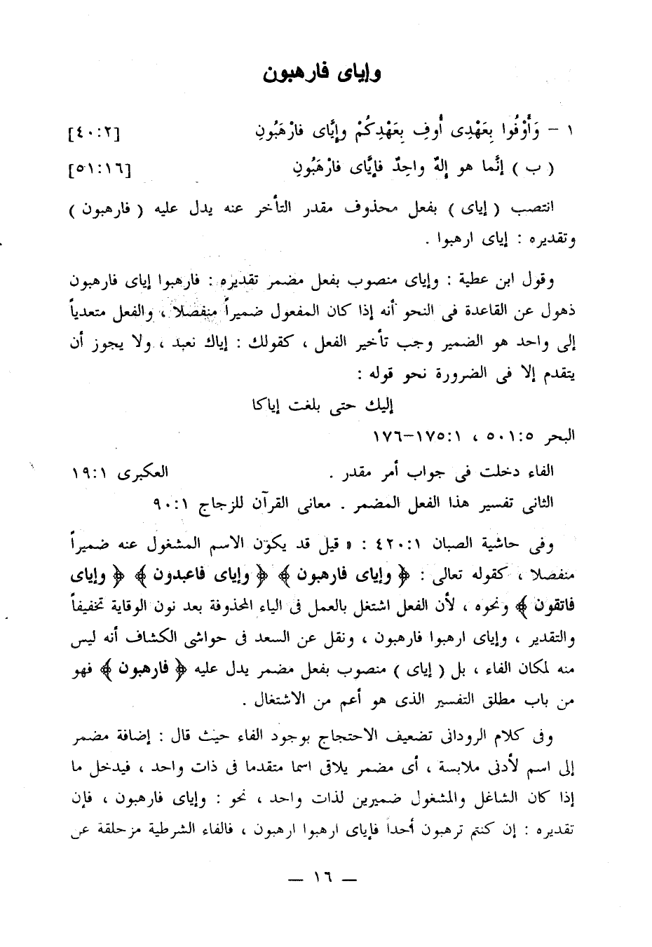 من باب الاشتغال (أي فإياي أعبدوا فاعبدون) وقال الزمخشري: فإن قلت: ما معنى الفاء في ظ وقال الزمخشري: فإن قلت: ما معنى الفاء في {فاعبدون}؟ تقدم المفعول؟ قلت: الفاء جواب شرط محذوف، لأن المعنى: إن أرضي واسعة فإن لم تخلصوا العبادة في أرض فاخلصوها في غيرها، ثم حذف فعل الشرط، وعوض من حذفه تقدم المفعول، مع إفادة تقديمه معنى الاختصاص والإخلاص.