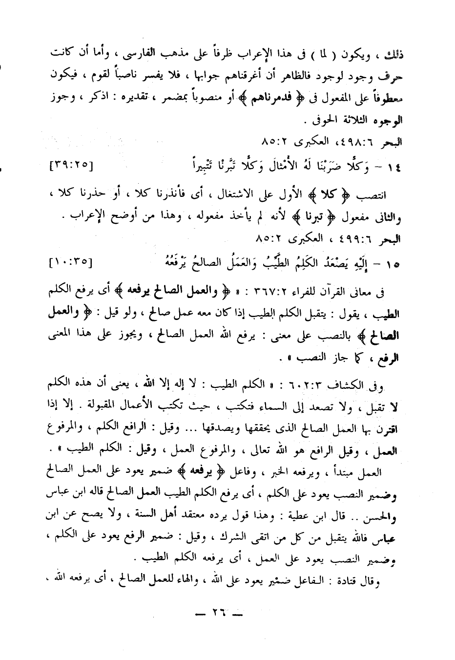 ويجوز عندي أن يكون العمل معطوفا على الكلم الطيب أي يصعدان إلى الله، و {يرفعه} استئناف أخبار، أي يرفعهما الله، ووحد الضمير لاشتراكهما في الصعود، والضمير قد يجرى مجرى اسم الإشارة، فيكون لفظه مفردا، والمراد به التثنية، فكأنه قيل: ليس صعودهما من ذاتهما، بل ذلك يرفع الله إيهاما.