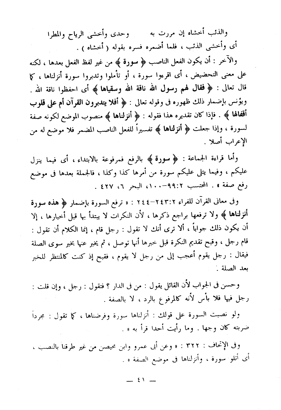 في المحتسب 2: 99 - 100: (قراءة أم الدرداء، وعيسى الثقفي، وعيسى الهمداني، ورويت عن عمر بن عبد العزيز: {سورة} بالنصب).