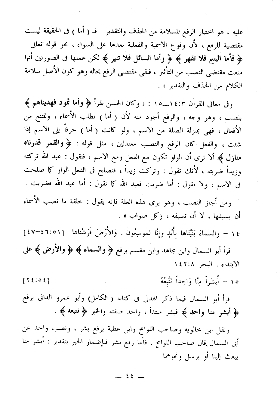 وفي شرح الكافية للرضي 1: 156 - 157: «وأما {أما} فإنما يرجح الرفع معها على النصب، مع القرينتين المذكورتين، لأن ترجح النصب في مثلهما بغير {أما} إنما كان لمراعاة التناسب بين المعطوف والمعطوف عليه في كونهما فعليتين، نحو: قام زيدا وعمرا أكرمته، أو لقصد التناسب بين السؤال والجواب في كونهما فعليتين نحو: زيدا أكرمته في جواب من قال أ] هم أكرمت، فإذا صدرت الجملتان بأما، نحو: قام زيد وأم عرم فقد أكرمته، وأما زيد فقد أعطيته دينارا في جواب: أيهم أعطيت، فإن (أما) من الحروف التي يبتدأ بعدها الكلام ويستأنف، ولا ينظر معها إلى ما قبلها، فلم يكن قصد التناسب معها لكون وضعها لضد مناسبة ما بعدها لما قبلها، أعنى الاستئناف، فرجعت بسببها الجملة إلى ما كانت في الأصل
