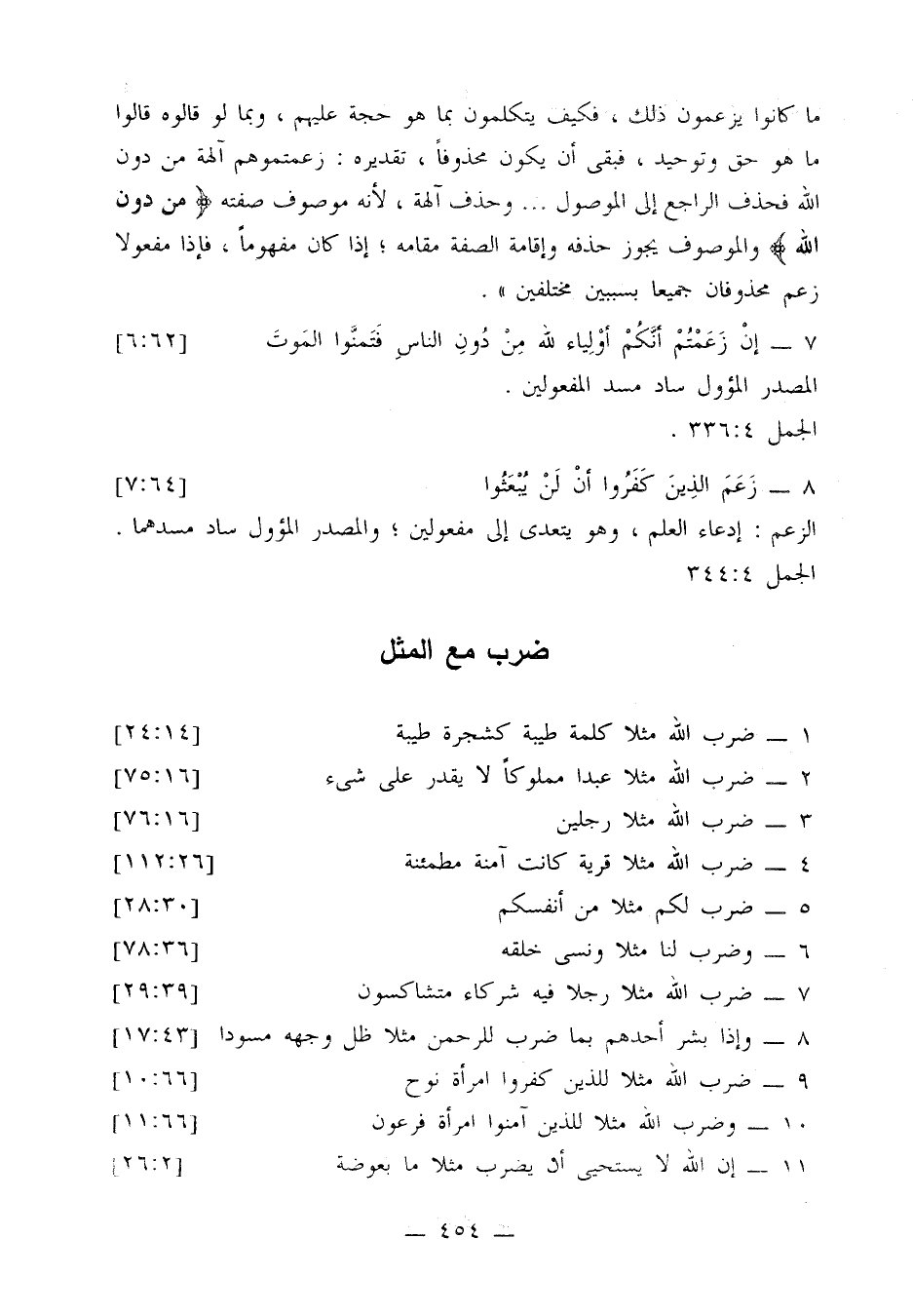 وفي الكشاف 3: 579: «فإن قلت: أين مفعولا زعم؟ قلت: أحدهما الضمير المحذوف الراجع إلى الموصول، وأما الثاني فلا يخلو إما أن يكون {من دون الله} أو {لا يملكون} أو محذوفًا.