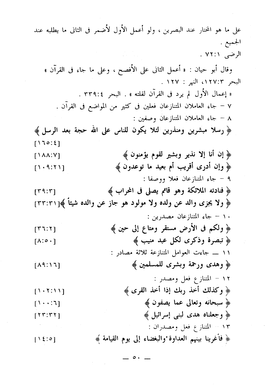 5 - لا يلزم أن يستوى المتنازعان في جهة التعدي مطلقا، بل قد يختلف الطلب، فيطلبه هذا على جهة الفاعلية، وهذا على جهة المفعولية، وذاك على جهة الظرف البحر 7: 130.