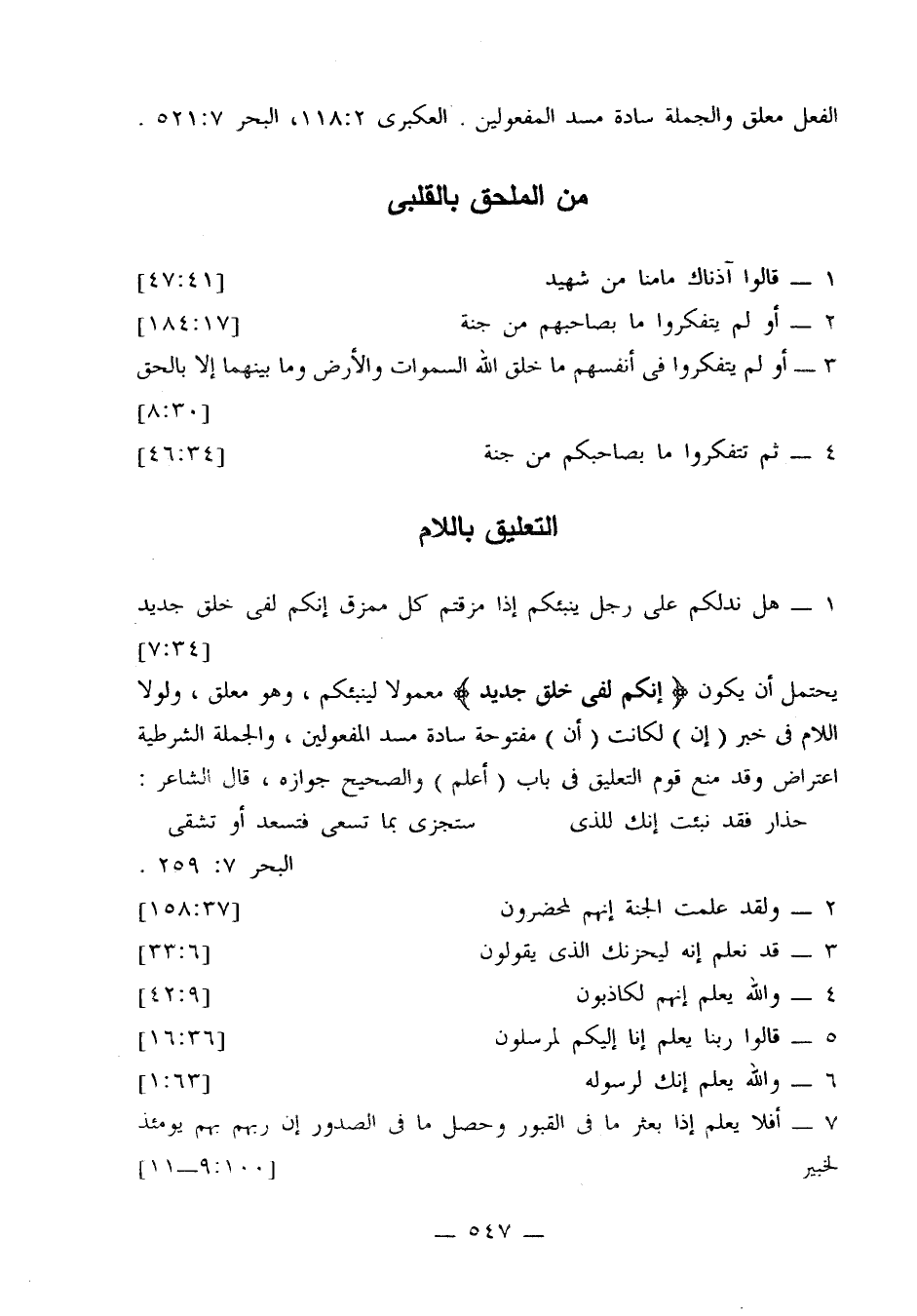 الجملة المنفية في موضع مفعولي علمت، إن تعدت إلى اثنين، أو في موضع المفعول، إن تعدت إلى واحد. البحر 6: 325.