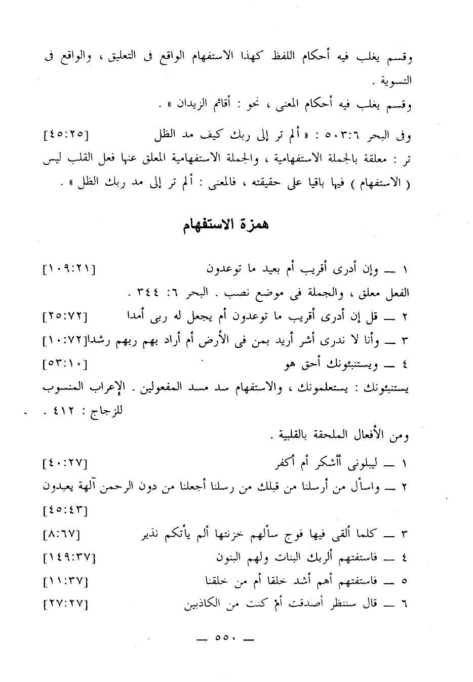 وقال في ص 264: «جميع أدوات الاستفهام ترد على الوجه المذكور، أي لمجرد الاستفهام بعد كل فعل شك، نحو: شككت أزيد في الدار أم عمرو، ونسيت أو ترددت أأقوم أو أقعد، كما ترد بعد كل فعل يفيد معنى العلم، كعلمت، وتبينت، ووريت، وبعد كل فعل يطلب به العلم، كفكرت، وامتحنت، وبلوت، وسألت، واستفهمت، وجميع أفعال الحواس الخمس كلمست وأبصرت، ونظرت، واستمعت، وشممت وذقت ... وقد يضمر الدال على التفكير، كقوله تعالى: {يتوارى من القوم من سوء ما بشر به أيمسكه على هون أم يدسه في التراب} أي متفكرًا أيمسكه على هون ... وجوز يونس تعليق جميع الأفعال».